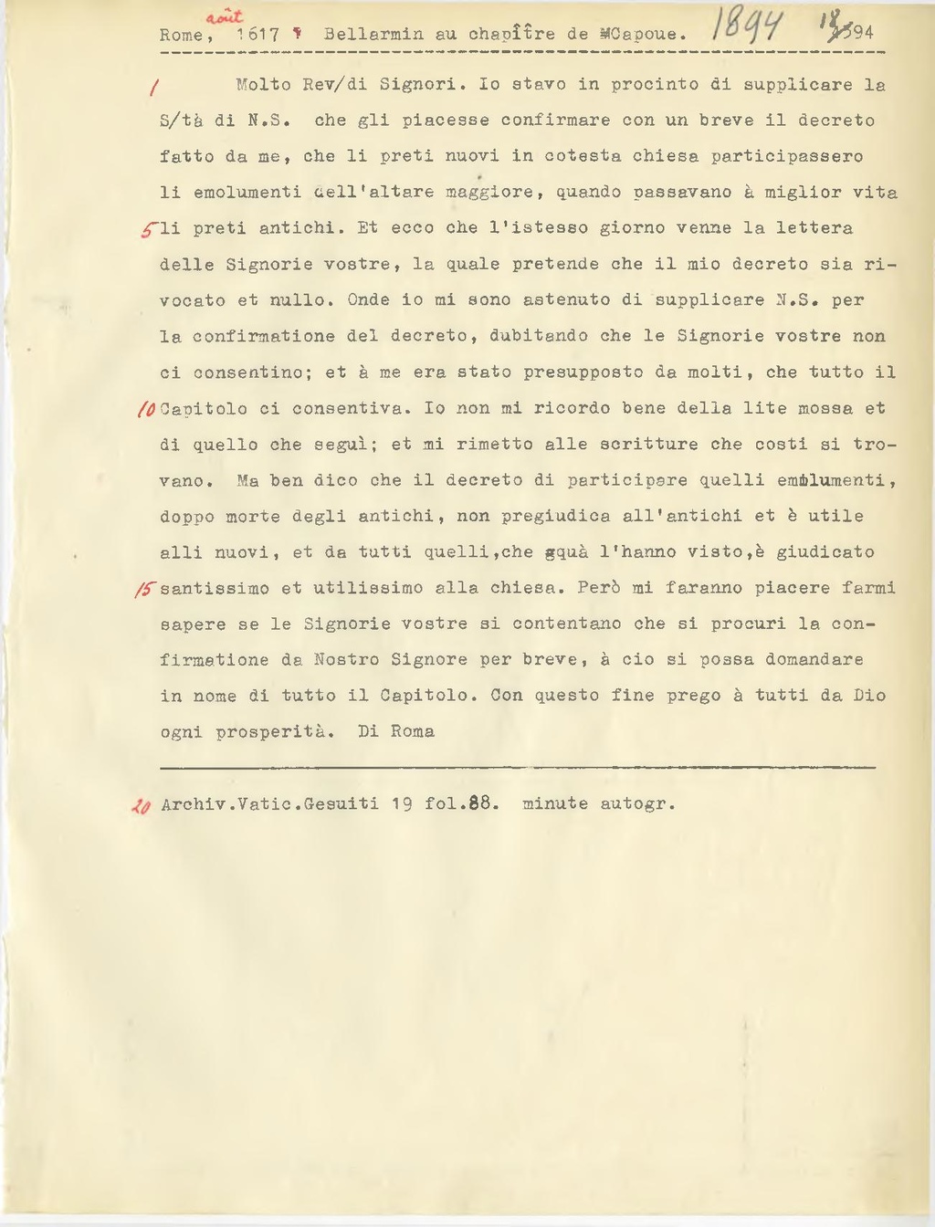 Molto Rev.di Signori. Io stavo in procinto di supplicare la S.tà di N.S. che gli piacesse confirmare con un breve il decreto fatto da me, che li preti nuovi in cotesta chiesa participassero li emolumenti nell'altare maggiore, quando passavano à miglior vita li preti antichi. Et ecco che l'istesso giorno venne la lettera delle Signorie vostre, la quale pretende che il mio decreto sia rivocato et nullo. Onde io mi sono astenuto di supplicare N.S. per la confirmatione del decreto, dubitando che le Signorie vostre non ci consentine; et à me era stato presupposto da molti, che tutto il Capitolo ci consentiva. Io non mi ricordo bene della lite mossa et di quello che seguì; et mi rimetto alle scritture che costi si trovano. Ma ben dico che il decreto di participare quelli emolumenti, doppo morte degli antichi, non pregiudica all'antichi et è utile alli nuovi, et da tutti quelli, che quà l'hanno visto, è giudicato