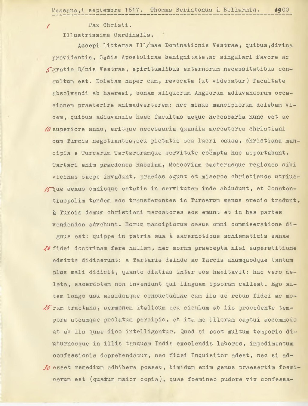providentia, Sedis Apostolicae benignitate, ac singulari favore ac gratia D.nis Vestrae, spiritualibus externorum necessitatibus consultum est. Dolebam nuper cum, revocata (ut videbatur) facultate absolvendi ab haeresi, bonam aliquorum Anglorum adiuvandorum occasionem praeterire animadverterem: nec minus mancipiorum dolebam vicem, quibus adiuvandis haec facultas aeque necessaria nunc est ac superiore anno, eritque necessaria quandiu mercatores christiani cum Turcis negotiantes, seu pietatis seu lucri causa, Christiana mancipia e Turcarum Tartarorumque servitute coempta huc asportabunt. Tartari enim praedones Russiam, Moscoviam oaeterasque regiones sibi vicinas saepe invadunt, praedas agunt et miseros christianos utriusque sexus omnisque aetatis in servitutem inde abdudunt, et Constantinopolim tandem eos transferentes in Turcarum manus precio tradunt, à Turcis demum christiani mercatores eos emunt et in has partes vendendos advehunt. Horum mancipiorum casus omni commiseratione dignus est: quippe in patria sua à sacerdotibus schismaticis sanae, fidei doctrinam fere nullam, nec morum praecepta nisi superstitione admixta didicerunt: a Tartaris deinde ac Turcis unumquodque tantum plus mali didicit, quanto diutius inter eos habitavit: huc vero delata, saoerdotem non inveniunt qui linguam ipsorum calleat. Ego autem longo usu assiduaque consuetudine cum iis de rebus fidei ac morum tractans, sermonem italicum seu siculum ab iis procedente tem pore utcumque prolatum percipio, et ita me illorum captui accommodo ut ab iis quae dico intelligantur. Quod si post multum temporis diuturnosque in illis tanquam Indis excolendis labores, impedimentum oonfessionis deprehendatur, nec fidei Inquisitor adest, nec si adesset remedium adhibere posset, timidum enim genus praesertim foeminarum est (quaium maior copia), quae foemineo pudore vix confessario