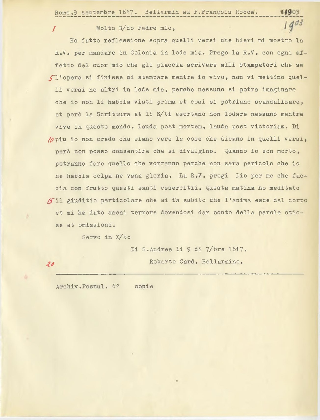 Ho fatto reflessione sopra quelli versi che hieri mi mostro la R.V. per mandare in Colonia in lode mia. Prego la R.V. con ogni affetto del cuor mio che gli piaccia scrivere alli stampatori che se l'opera si finisse di stampare mentre io vivo, non vi mattino quel li versi ne altri in lode mia, perche nessuno si potra immaginare che io non li habbia visti prima et cosi si potriano scandalizare, et però la Scrittura et li S.ti esortano non lodare nessuno mentre vive in questo mondo, lauda post mortem, lauda post victoriam. Di piu io non credo che siano vere le cose che dicano in quelli versi, però non posso consentire che si divulgino. Quando io son morto, potranno fare quello che vorranno perche non sara pericolo che io ne habbia colpa ne vana gloria. La R.V. pregi Dio per me che faccia con frutto questi santi essercitii. Questa matina ho meditato il giuditio particolare che si fa subito che l'anima esce dal corpo et mi ha dato assai terrore dovendosi dar conto della parole otiose et omissioni.