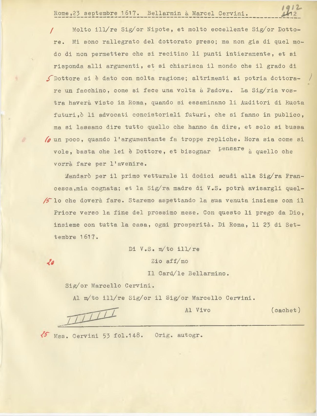 Mandarò per il primo vetturale li dodici scudi alla Sig.ra Francesca, mia cognata; et la Sig.ra madre di V.S. potrà avisargli quello che doverà fare. Staremo aspettando la sua venuta insieme con il Priore verso la fine del prossimo mese. Con questo li prego da Dio, insieme con tutta la casa, ogni prosperità. Di Roma, li 23 di Settembre 1617.