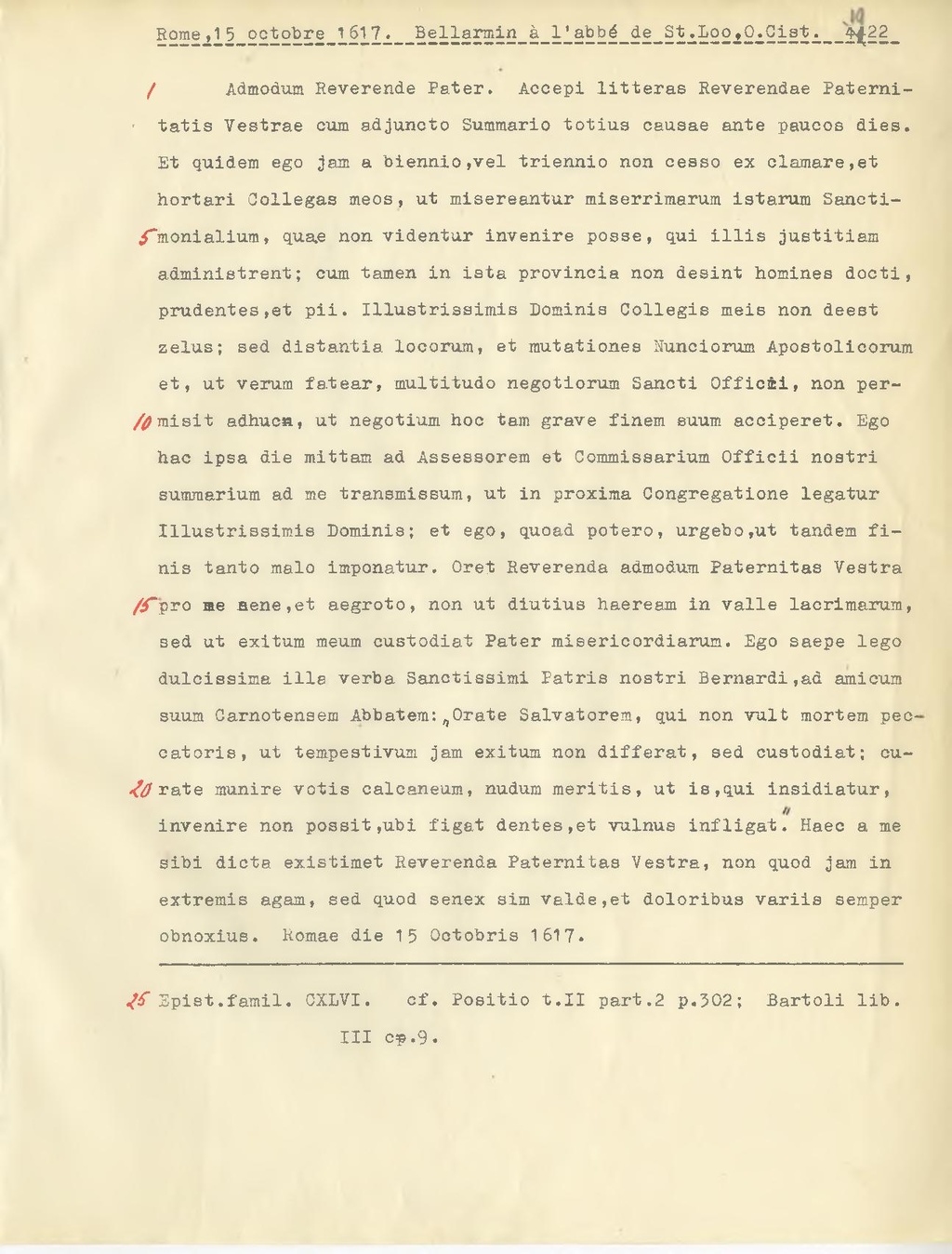 Admodum Reverende Pater. Accepi litteras Reverendae Paternitatis Vestrae cum adjuncto Summario totius causae ante paucos dies. Et quidem ego jam a biennio, vel triennio non cesso ex clamare, et hortari Collegas meos, ut misereantur miserrimarum istarum Sanctimonialium, quas non videntur invenire posse, qui illis justitiam administrent; cum tamen in ista provincia non desini homines docti, prudentes, et pii. Illustrissimis Dominis Collegis meis non deest zelus; sed distantia locorum, et mutationes Nunciorum Apostolicorum et, ut verum fatear, multitudo negotiorum Sancti Offici, non permisit adhuca, ut negotium hoc tam grave finem suum acciperet. Ego hac ipsa die mittam ad Assessorem et Commissarium Officii nostri summarium ad me transmissum, ut in proxima Congregatione legatur Illustrissimis Dominis; et ego, quoad potero, urgebo, ut tandem finis tanto malo imponatur. Oret Reverenda admodum Paternitas Vostra, pro me sene, et aegroto, non ut diutius haeream in valle lacrimarum, sed ut exitum meum custodiat Pater misericordiarum. Ego saepe lego dulcissima illa verba Sanctissimi Patria nostri Bernardi, ad amicum suum Carnotensem Abbatem: Orate Salvatorem, qui non vult mortem peccatoris, ut tempestivum jam exitum non differat, sed custodiat; curate munire votis calcaneum, nudum meritis, ut is, qui insidiatur, invenire non possit, ubi figat dentea, et vulnus infligat. Haec a me sibi dieta existimet Reverenda Paternitas Vostra, non quod jam in extremis agam, sed quod senex sim valde, et doloribus variis semper obnoxius. Romae die 15 Ootobris 1617.
