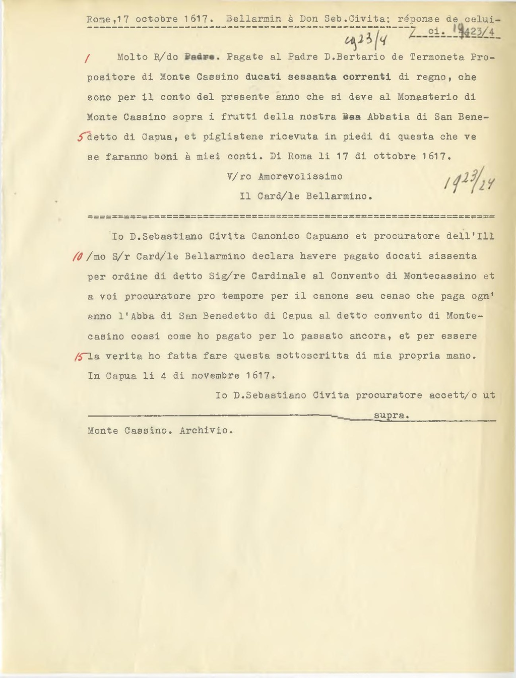 Io D. Sebastiano Civita Canonico Capuano et procuratore dell'Ill.mo S.r Car.le Bellarmino declara havere pagato docati sissenta per ordine di detto Sig.re Cardinale al Convento di Montecassino et a voi procuratore pro tempore per il canone seu censo che paga ogn'anno l'Abba di San Benedetto di Capua al detto convento di Montecasino cossi come ho pagato per lo passato ancora, et per essere la verità ho fatta fare questa sottoscritta di mia propria mano.