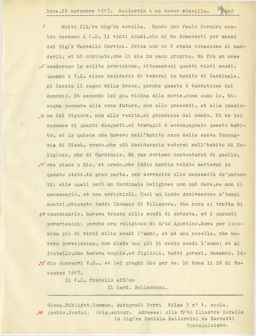 mandaremo la solita provisione, ritenendoci questi vinti scudi. Quando à V.S. viene desiderio di vedermi in habito di Cardinale, si faccia il segno della Croce, perche questa è tentatione del demonio. Et essendo lei già vicina alla morte[1], come sono io, bisogna pensare alle cose future, non alle presenti, et alla passione del Signore, non alle vanità, et grandezze del mondo. Et se lei sapesse di quanti disgusti, et travagli è accompagnato questo habito, et la quiete che havevo nell'habito nero della santa Compagnia di Giesù, credo, che più desideraria vedermi nell'habito di Religioso, che di Cardinale. Mà pur doviamo contentarci di quello, che piace à Dio, et credo, che Iddio habbia voluto mettermi in questo stato, in gran parte, per sovvenire alle necessità de'parenti; alle quali però un Cardinale Religioso non può dare, se non il necessario, et non arrichirli. Così un Santo Arcivescovo à'tempi nostri, chiamato Padre Thomaso di Villanova, che hora si tratta di canonizarlo, haveva trenta milia scudi di entrata, et i parenti poverissimi; perche era religioso di S.to Agostino, dava per limosina più di vinti milia scudi l'anno, et ad una sorella, che haveva poverissima, non diede mai più di cento scudi l'anno; et al fratello, che haveva moglie, et figlioli, tutti poveri, ducente. Iddio conservi V.S., et lei preghi Dio per me. Di Roma li 26 di Novembre 1617.