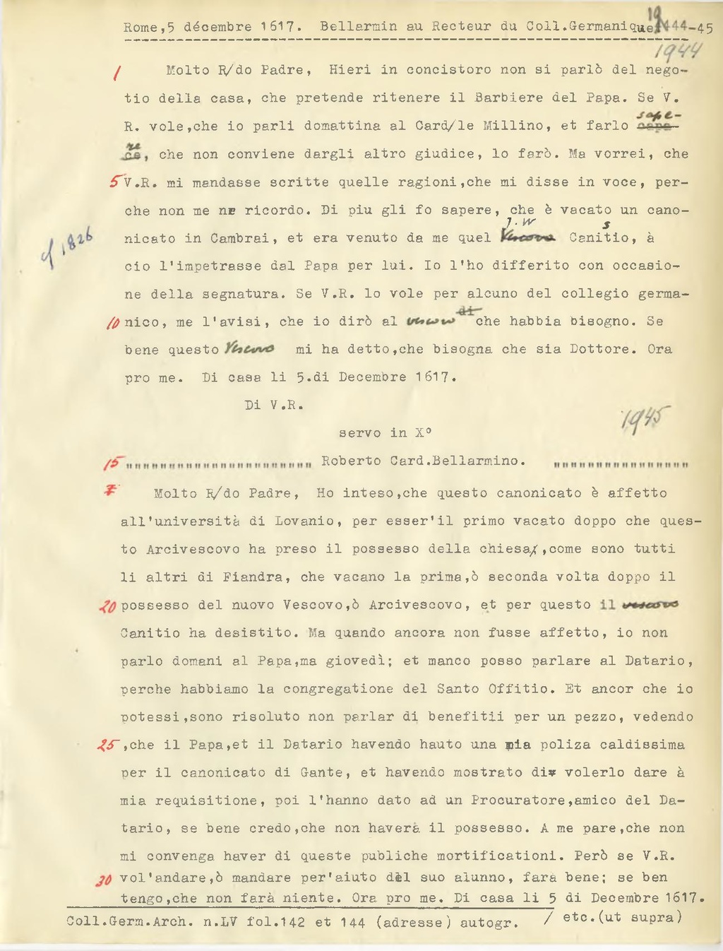 Molto R.do Padre, Ho inteso,che questo canonicato è affetto all'università di Lovanio, per esser'il primo vacato doppo ohe questo Arcivescovo ha preso il possesso della chiesa, come sono tutti li altri di Fiandra, che vacano la prima, ò seconda volta doppo il possesso del nuovo Vescovo, ò Arcivescovo, et per questo Canitio ha desistito. Ma quando ancora non fusse affetto, io non parlo domani al Papa,ma giovedì; et manco posso parlare al Datario, perche habbiamo la congregatione del Santo Offitio. Et ancor che io potessi, sono risoluto non parlar di benefitii per un pezzo, vedendo, che il Papa, et il Datario havendo haute una mia poliza caldissima per il canonicato di Gante, et havendo mostrato di volerlo dare à mia requisitione, poi l'hanno dato ad un Procuratore, amico del Datario, se bene credo, che non haverà il possesso. A me pare, che non mi convenga haver di queste publiche mortificationi. Però se V.R. vol'andare, ò mandare per'aiuto del suo alunno, farà bene; se ben tengo, che non farà niente. Ora pro me. Di casa li 5 di Decembre 1617. etc.(ut supra)