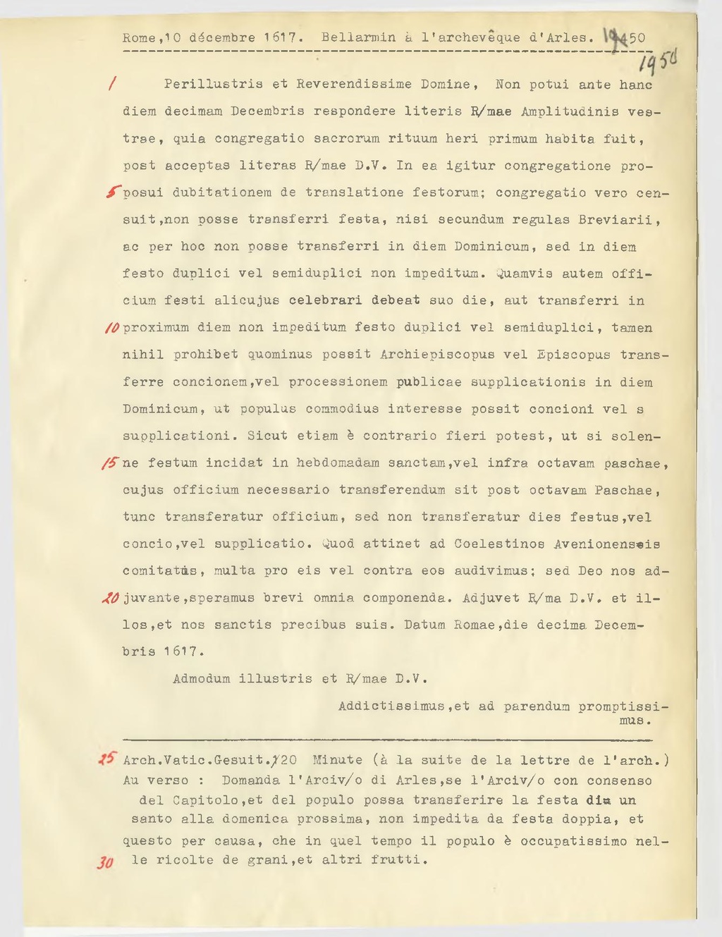 Perillustris et Reverendissime Domine, Non potui ante hanc diem decimam Decembris respondere literis R.mae Amplitudinis vestrae, quia congregatio sacrorum rituum heri primum habita fuit, post acceptas literas R.mae D.V. In ea igitur congregatione proposui dubitationem de translatione festorum; congregatio vero censuit, non posse transferri festa, nisi secundum regulas Breviarii, ac per hoc non posse transferri in diem Dominicum, sed in diem festo duplici vel semiduplici non impeditum. Quamvis autem officium fasti alicujus celebraci debeat suo die, aut transferri in proximum diem non impeditum festo duplici vel semiduplici, tamen nihil prohibet quominus possit Archiepiscopus vel Episcopus transferre concionem, vel processionem publicae supplicationis in diem Dominicum, ut populus commodius interesse possit concioni vel s supplicationi. Sicut etiam è contrario fieri potest, ut si solenne festum incidat in hebdomadam sanctam, vel infra octavam paschae, cujus officium necessario transferendum sit post octavam Paschae, tunc transferatur officium, sed non transferatur dies festus, vel concio, vel supplicatio. Quod attinet ad Coelestinos Avenionensis comitatus, multa pro eis vel contra eos audivimus; sed Deo nos adjuvante, speramus brevi omnia componenda. Adjuvet R.ma D.V. et illos, et nos sanctis precibus suis. Datum Romae, die decima Decem bris 1617.