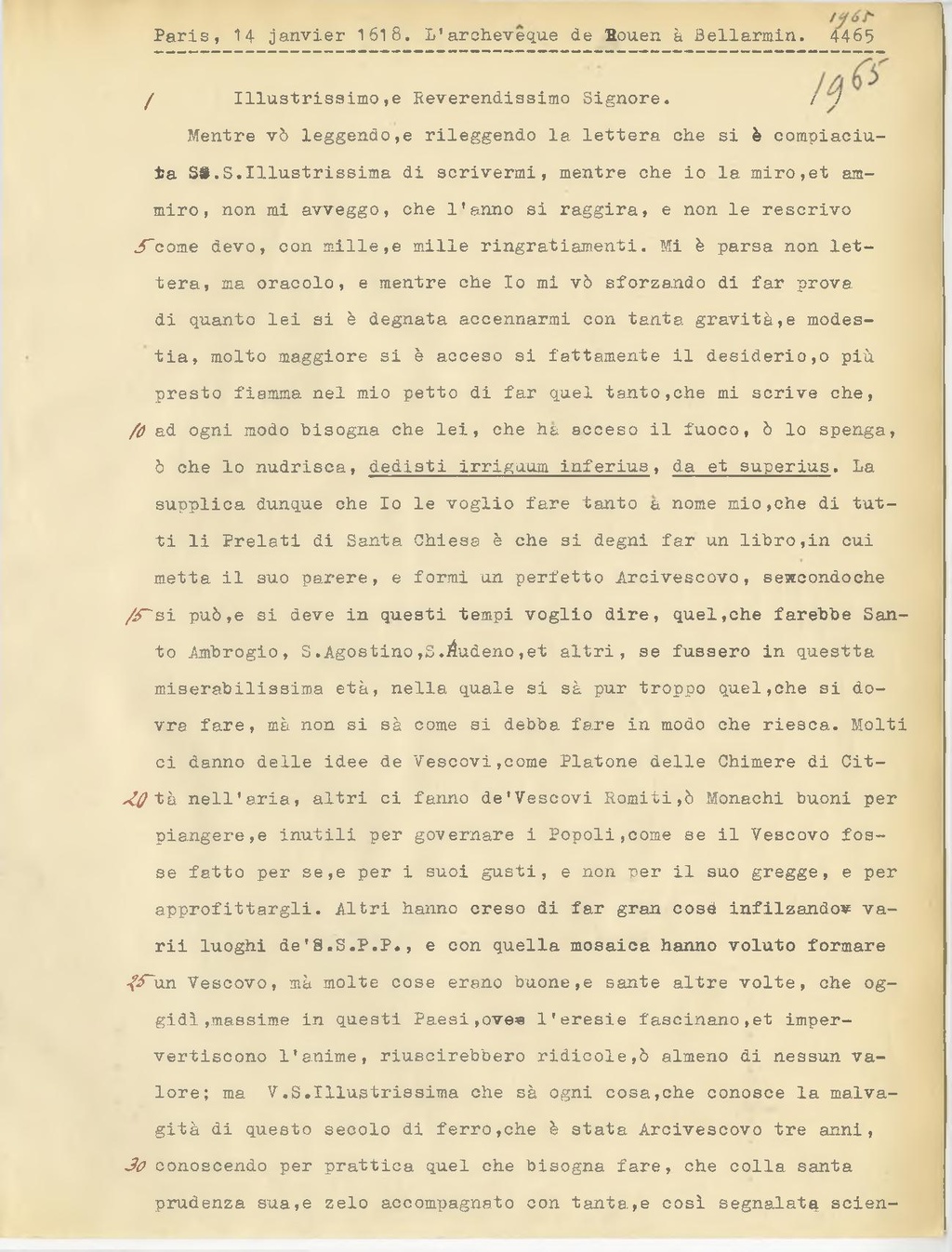 presto fiamma nel mio petto di far quel tanto, che mi scrive che, ad ogni modo bisogna che lei, che ha acceso il fuoco, ò lo spenga, ò che lo nudrisca, dedisti irriguum inferius, da et superius. La supplica dunque che Io le voglio fare tanto a nome mio, che di tutti li Prelati di Santa Chiesa è che si degni far un libro, in cui metta il suo parere, e formi un perfetto Arcivescovo, secondoche si può, e si deve in questi tempi voglio dire, quel, che farebbe Santo Ambrogio, S. Agostino, S. Audeno, et altri, se fussero in questta miserabilissima età, nella quale si sà pur troppo quel, che si dovrà fare, mà non si sà come si debba fare in modo che riesca. Molti