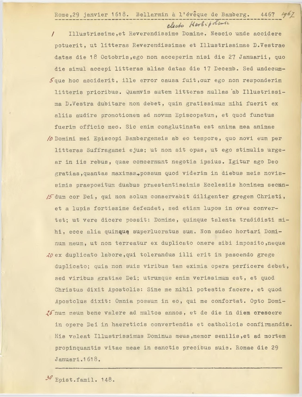 Illustrissime, et Reverendissime Domine. Nescio unde accidere potuerit, ut litteras Reverendissimae et Illustrissimae D. Vestrae datas die 18 Octobris, ego non acceperim nisi die 27 Januarii, quo die simul accepi litteras alias datas die 17 Decemb. Sed undecumque hoc acciderit, ille error causa fuit, cur ego non responderim litteris prioribus. Quamvis autem litteras nullas 'ab Illustrissima D. Vestra dubitare non debet, quin gratissimum mihi fuerit ex aliis audire promotionem ad novum Episcopatum, et quod functus fuerim officio meo. Sic enim conglutinata est anima mea animae Domini mei Episcopi Bambergensis ab eo tempore, quo novi eum per litteras Suffraganei ejus; ut non sit opus, ut ego stimulis urgear in iis rebus, quae concernunt negotia ipsius. Igitur ago Deo gratias, quantas maximas possum quod viderim in diebus mais novissimis praepositum duabus praestantissimis Ecclesiis hominem secundum cor Dei, qui non solum conservabit diligenter gregem Christi, et a lupis fortissime defendet, sed etiam lupos in oves convertet; ut vere dicere possit: Domine, quinque talenta tradidisti mi hi, ecce alia quinquq superlucratus sum. Non audeo hortari Dominum meum, ut non terreatur ex duplicato onere sibi imposito, neque ex duplicato labore, qui tolerandus illi erit in pascendo grege duplicato; quia non suis viribus tam eximia opera perficere debet, sed viribus gratiae Dei; utrumque enim verissimum est, et quod Christus dixit Apostolis: Sine me nihil potestis facere, et quod Apostolus dixit: Omnia possum in eo, qui me confortat. Opto Dominum meum bene valere ad multos annos, et de die in diem crescere in opere Dei in haereticis convertendis et catholicis confirmandis. His valeat Illustrissimus Dominus meus,memor senilis, et ad mortem propinquantis vitae meae in sanctis precibus suis. Romae die 29 Januari. l6l6.
