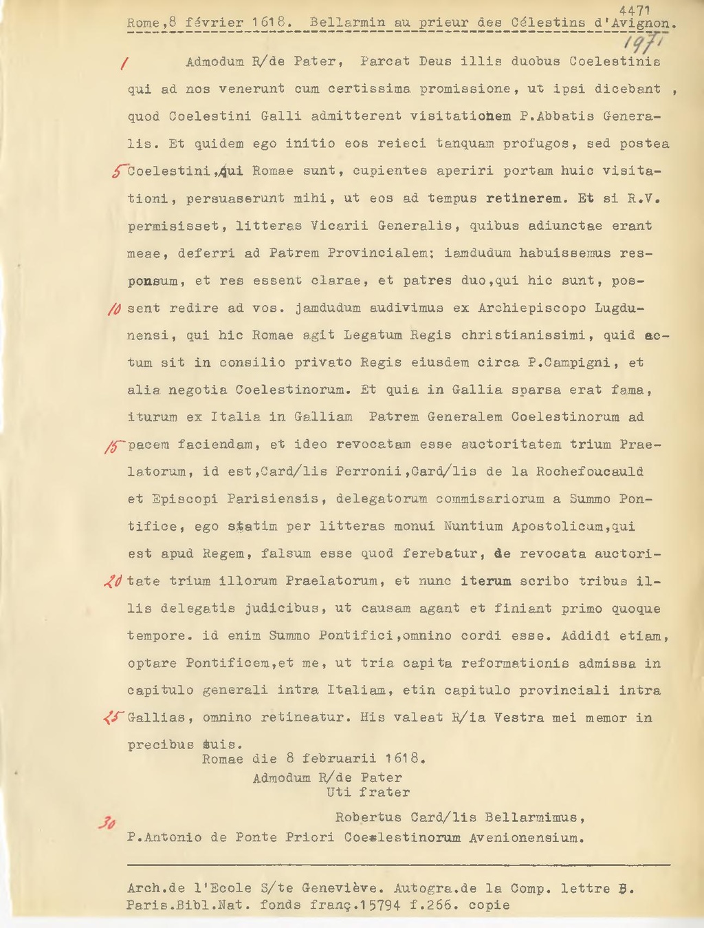 Admodum R.de Pater, Parcat Deus illis duobus Coelestinis qui ad nos venerunt cum certissima promissione, ut ipsi dicebant , quod Coelestini Galli admitterent visitatiohem P. Abbatis Generalis. Et quidem ego initio eos reieci tanquam profugos, sed postea Coelestini, qui Romae sunt, cupientes aperiri portam buie visitationi, persuaserunt mihi, ut eos ad tempus retinerem. Et si R.V. permisisset, litteras Vicarii Generalis, quibus adiunctae erant meae, deferri ad Patrem Provincialem; iamdudum habuissemus responsum, et res essent clarae, et patres duo,qui hic sunt, possent redire ad vos. jamdudum audivimus ex Archiepiscopo Lugdunensi, qui hic Romae agit Legatum Regis christianissimi, quid actum sit in Consilio privato Regis eiusdem circa P. Campigni, et alia negotia Coelestinorum. Et quia in Gallia sparsa erat fama, iturum ex Italia in Galliam Patrem Generalem Coelestinorum ad pacem faciendam, et ideo revocatam esse auctoritatem trium Praelatorum, id est, Card.lis Perronii, Card.lis de la Rochefoucauld et Episcopi Parisiensis, delegatorum commisariorum a Summo Pontifico, ego statim per litteras monui Nuntium Apostolicum, qui est apud Regem, falsum esse quod ferebatur, de revocata auctoritate trium illorum Praelatorum, et nunc iterum scribo tribus illis delegatis judicibus, ut causam agant et finiant primo quoque tempore, id enim summo Pontifici, omnino cordi esse. Addidi etiam, optare Pontificem, et me, ut tria capita reformationis admissa in capitulo generali intra Italiam, etin capitulo provinciali intra Gallias, omnino retineatur. His valeat R.ia Vestra mei memor in precibus suis.