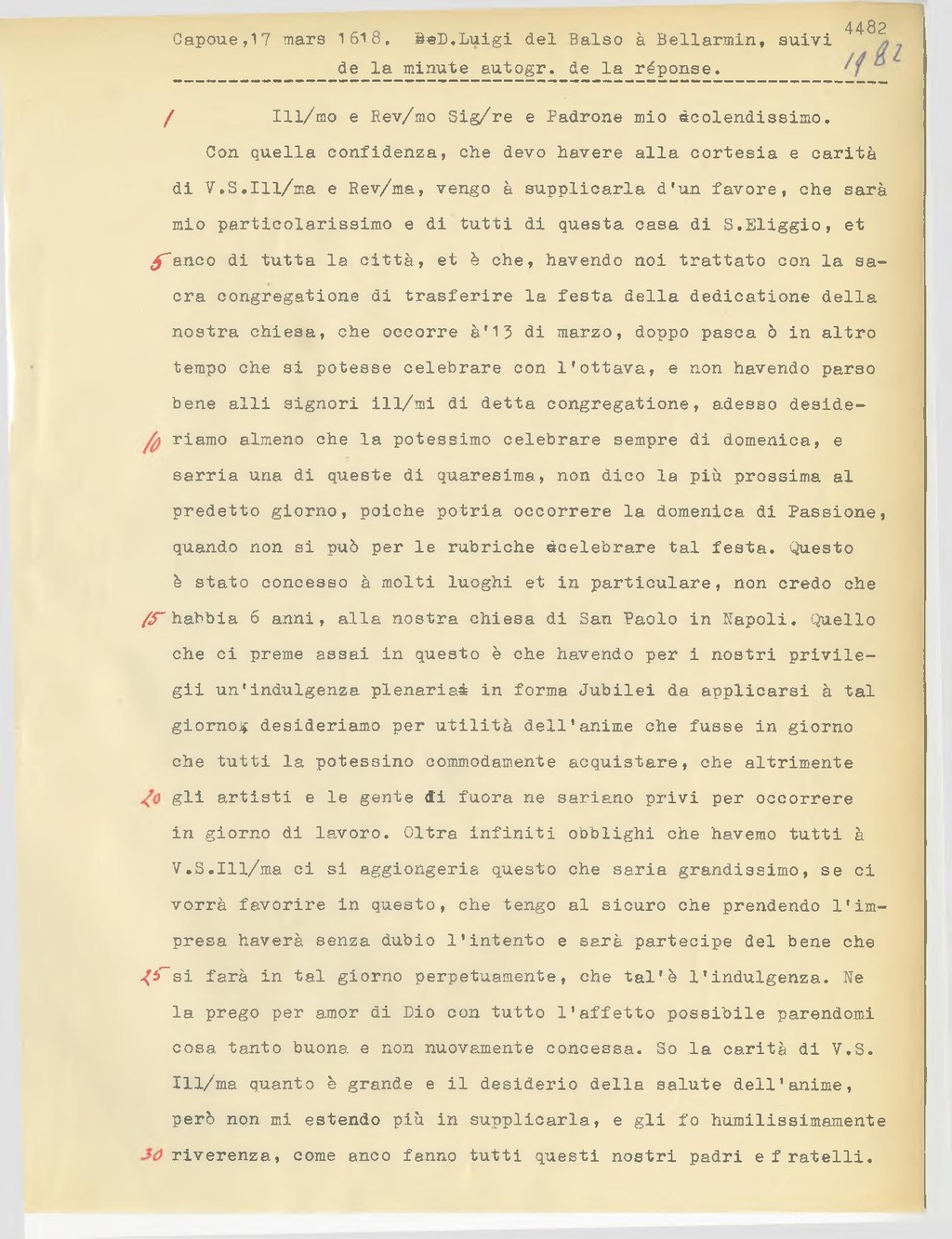 Con quella confidenza, che devo havere alla cortesia e carità di V.S. Ill.ma e Rev.ma, vengo à supplicarla d'un favore, che sarà mio particolarissimo e di tutti di questa casa di S. Eliggio, et Tanco di tutta la città, et è che, havendo noi trattato con la sacra congregatione di trasferire la festa della dedicatione della nostra chiesa, che occorre à'13 di marzo, doppo pasca ò in altro tempo che si potesse celebrare con l'ottava, e non havendo parso bene alli signori ill.mi di detta congregatione, adesso desideriamo almeno che la potessimo celebrare sempre di domenica, e sarria una di queste di quaresima, non dico la più prossima al predetto giorno, poichè potria occorrere la domenica di Passione, quando non si può per le rubriche celebrare tal festa. Questo è stato concesso à molti luoghi et in particulare, non credo che habbia 6 anni, alla nostra chiesa di San Paolo in Napoli. Quello che ci preme assai in questo è che havendo per i nostri privilegii un'indulgenza plenaria in forma Jubilei da applicarsi à tal giorno desideriamo per utilità dell'animo che fusse in giorno che tutti la potessino commodamente acquistare, che altrimente gli artisti e le gente di fuora ne sariano privi per occorrere in giorno di lavoro. Oltra infiniti obblighi che havemo tutti à V.S. Ill.ma ci si aggiongeria questo che saria grandissimo, se ci vorrà favorire in questo, che tengo al sicuro che prendendo l'im presa haverà senza dubio l'intento e sarà partecipe del bene che si farà in tal giorno perpetuamente, che tal'è l'indulgenza. Ne la prego per amor di Dio con tutto l'affetto possibile parendomi cosa tanto buona e non nuovamente concessa. So la carità di V.S. Ill.ma quanto è grande e il desiderio della salute dell'anime, però non mi estendo più in supplicarla, e gli fo humilissimamente riverenza, come anco fanno tutti questi nostri padri e fratelli.