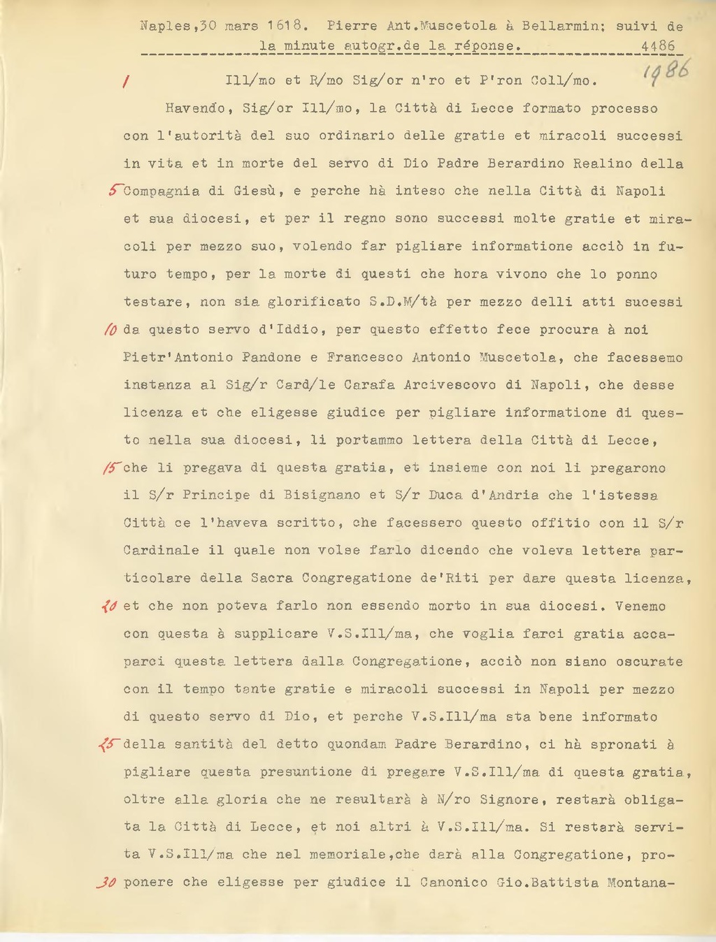 con l'autorità del suo ordinario delle gratie et miracoli successi in vita et in morte del servo di Dio Padre Berardino Realino della Compagnia di Giesù, e perche hà inteso che nella Città di Napoli et sua diocesi, et per il regno sono successi molte gratie et miracoli per mezzo suo, volendo far pigliare informatione acciò in fu turo tempo, per la morte di questi che hora vivono che lo ponno testare, non sia glorificato S.D. M.tà per mezzo delli atti sucessi da questo servo d'iddio, per questo effetto fece procura à noi Pietr'Antonio Bandone e Francesco Antonio Muscetola, che facessemo instanza al Sig.r Card.le Carafa Arcivescovo di Napoli, che desse licenza et che eligesse giudice per pigliare informatione di questo nella sua diocesi, li portammo lettera della Città di Lecce, che li pregava di questa gratia, et insieme con noi li pregarono