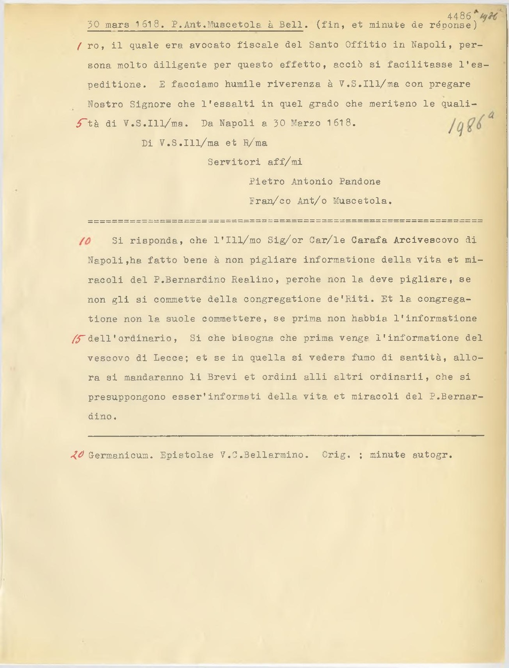 Si risponda, che l'Ill.mo Sig.or Car.le Carafa Arcivescovo di Napoli,ha fatto bene à non pigliare informatione della vita et miracoli del P. Bernardino Realino, perche non la deve pigliare, se non gli si commette della congregatione de'Riti. Et la congregatione non la suole commettere, se prima non habbia l'informatione dell'ordinario. Si che bisogna che prima venga l'informatione del vescovo di Lecce; et se in quella si vedere fumo di santità, allora si manderanno li Brevi et ordini alli altri ordinarli, che si presuppongono esser'informati della vita et miracoli del P. Bernardino.