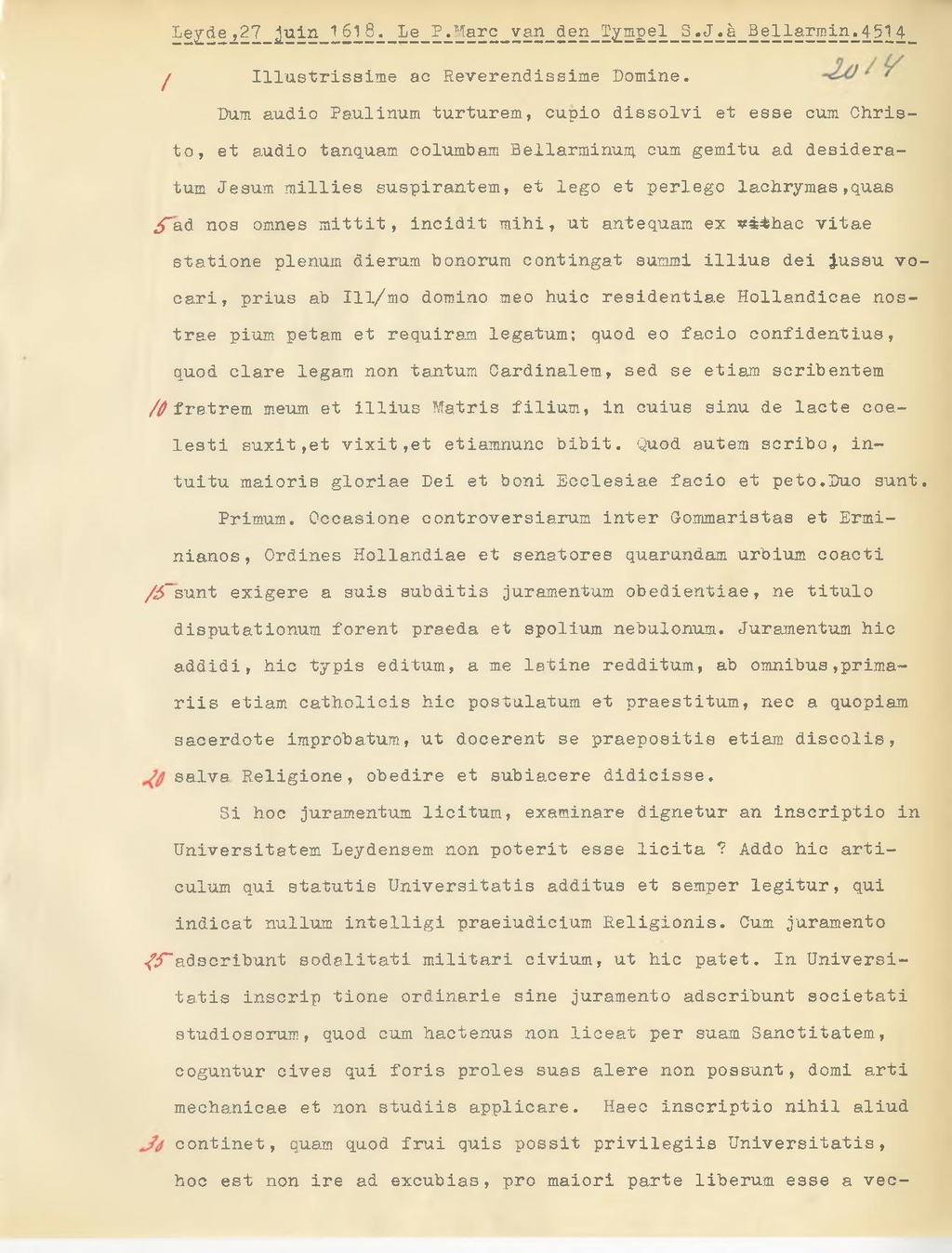 Dum audio Paulinum turturem, cupdo dissolvi et esse cum Christo, et audio tanquam columbam Bellarminum cum gemitu ad desideratum Jesum millies suspirantem, et lego et perlego lachrymas, quas ad nos omnes mittit, incidit mihi, ut antequam ex hac vitae statione plenum dierum bonorum contingat summi illius dei iussu vocari, prius ab Ill.mo domino meo huic residentiae Hollandicae nostrae pium petam et requiram legatum; quod eo facio confidentius, quod clare legam non tantum Cardinalem, sed se etiam scribentem fratrem meum et illius Matris filium, in cuius sinu de lacte coelesti suxit, et vixit, et etiamnunc bibit. Quod autem scribo, intuitu maioris gloriae Dei et boni Ecclesiae facio et peto. Duo sunt.