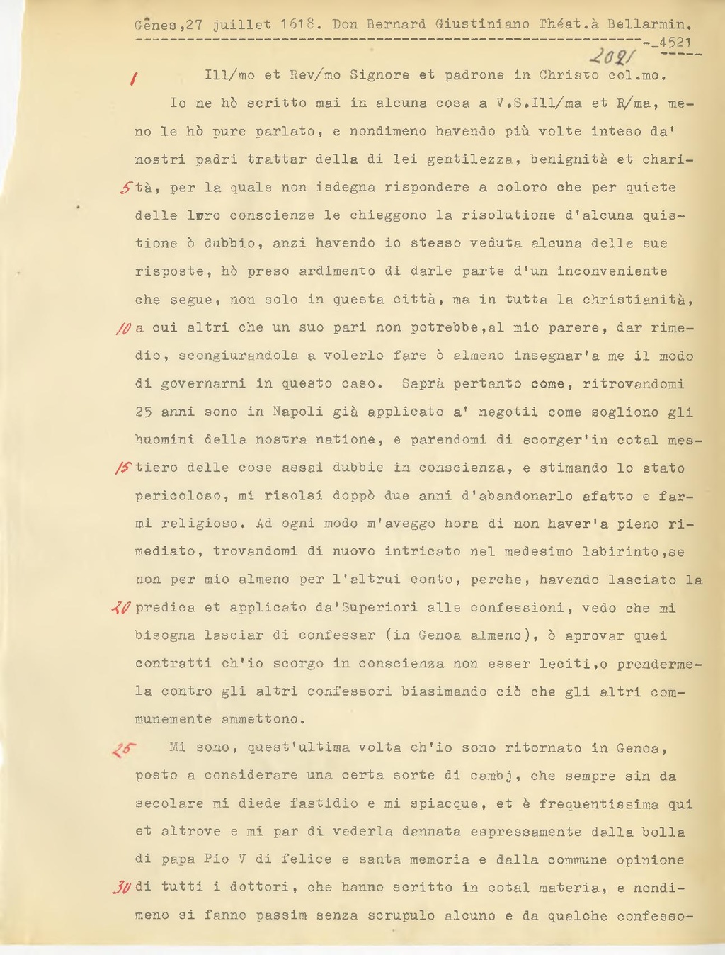 no le hò pure parlato, e nondimeno havendo più volte inteso da' nostri padri trattar della di lei gentilezza, benignità et charità, per la quale non isdegna rispondere a coloro che per quiete delle Ipro conscienze le chieggono la risolutione d'alcuna quistione ò dubbio, anzi havendo io stesso veduta alcuna delle sue risposte, hò preso ardimento di darle parte d'un inconveniente che segue, non solo in questa città, ma in tutta la christianità, a cui altri che un suo pari non potrebbe,al mio parere, dar rime dio, scongiurandola a volerlo fare ò almeno insegnar'a me il modo di governarmi in questo caso. Saprà pertanto come, ritrovandomi 25 anni sono in Napoli già applicato a' negotii come sogliono gli huomini della nostra natione, e parendomi di scorger'in cotal mestiero delle cose assai dubbie in conscienza, e stimando lo stato pericoloso, mi risolsi doppò due anni d'abandonarlo afatto e far mi religioso. Ad ogni modo m'aveggo hora di non haver'a pieno rimediato, trovandomi di nuovo intricato nel medesimo labirinto, se non per mio almeno per l'altrui conto, perche, havendo lasciato la predica et applicato da'Superiori alle confessioni, vedo che mi bisogna lasciar di confessar (in Genoa almeno), ò aprovar quei contratti ch'io scorgo in conscienza non esser leciti,o prenderme la contro gli altri confessori biasimando ciò che gli altri communemente ammettono.