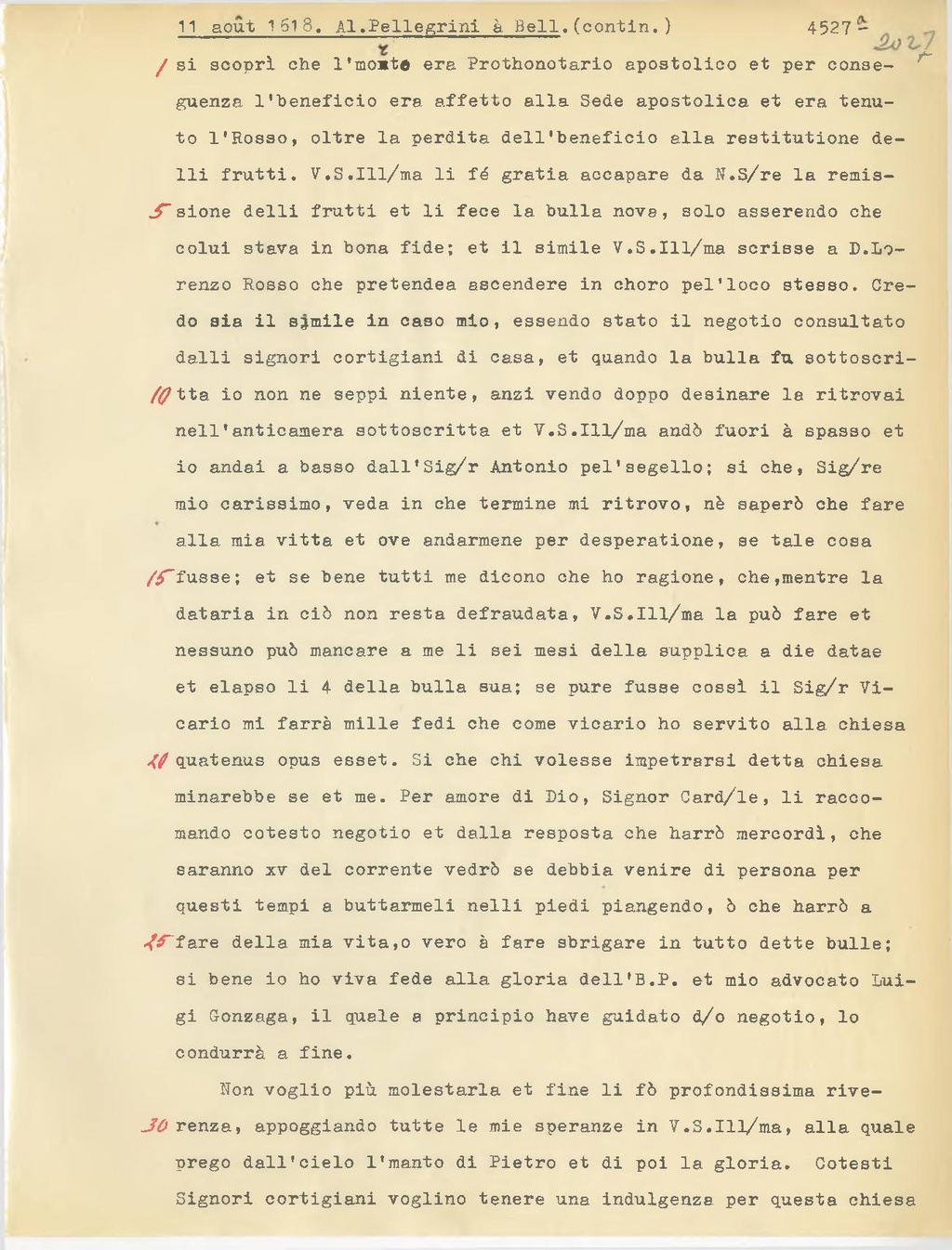 si scoprì che l'monto era Prothonotario apostolico et per conseguenza l'beneficio era affetto alla Sede apostolica et era tenuto l'Rosso, oltre la perdita dell'beneficio alla restitutione delli frutti. V.S. Ill.ma li fè gratia accapare da N. S.re la remissione delli frutti et li fece la bulla nova, solo asserendo che colui stava in bona fide; et il simile V.S. Ill.ma scrisse a D. Lorenzo Rosso che pretendea ascendere in choro pel'loco stesso. Credo sia il simile in caso mio, essendo stato il negotio consultato