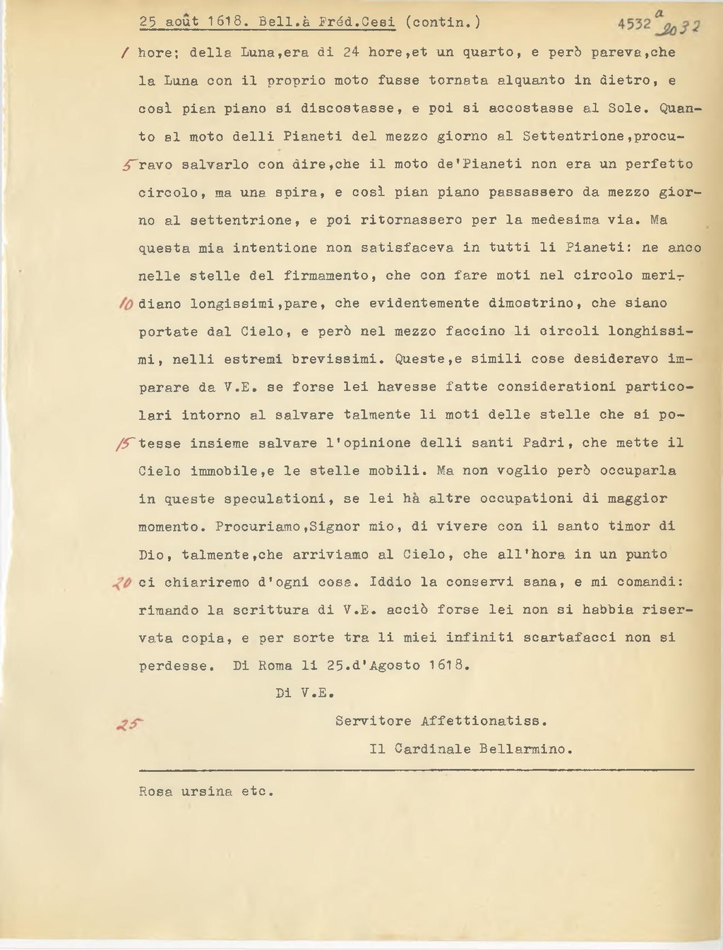 hore; della Luna,era di 24 hore, et un quarto, e però pareva,che la Luna con il proprio moto fusse tornata alquanto in dietro, e così pian piano si discostasse, e poi si accostasse al Sole. Quanto al moto delli Pianeti del mezzo giorno al Settentrione, procuravo salvarlo con dire,che il moto de'Pianeti non era un perfetto circolo, ma una spira, e così pian piano passassero da mezzo giorno al settentrione, e poi ritornassero per la medesima via. Ma questa mia intentione non satisfaceva in tutti li Pianeti: ne anco nelle stelle del firmamento, che con fare moti nel circolo meridiano longissimi, pare, che evidentemente dimostrino, che siano portate dal Cielo, e però nel mezzo faccino li circoli longhissimi, nelli estremi brevissimi. Queste, e simili cose desideravo imparare da V.E. se forse lei havesse fatte considerationi particolari intorno al salvare talmente li moti delle stelle che si potesse insieme salvare l'opinione delli santi Padri, che mette il Cielo immobile, e le stelle mobili. Ma non voglio però occuparla in queste speculationi, se lei ha altre occupationi di maggior momento. Procuriamo, Signor mio, di vivere con il santo timor di Dio, talmente, che arriviamo al Cielo, che all'hora in un punto ci chiariremo d'ogni cosa. Iddio la conservi sana, e mi comandi: rimando la scrittura di V.E. acciò forse lei non si habbia riservata copia, e per sorte tra li miei infiniti scartafacci non si perdesse. Di Roma li 25. d'Agosto 1618.