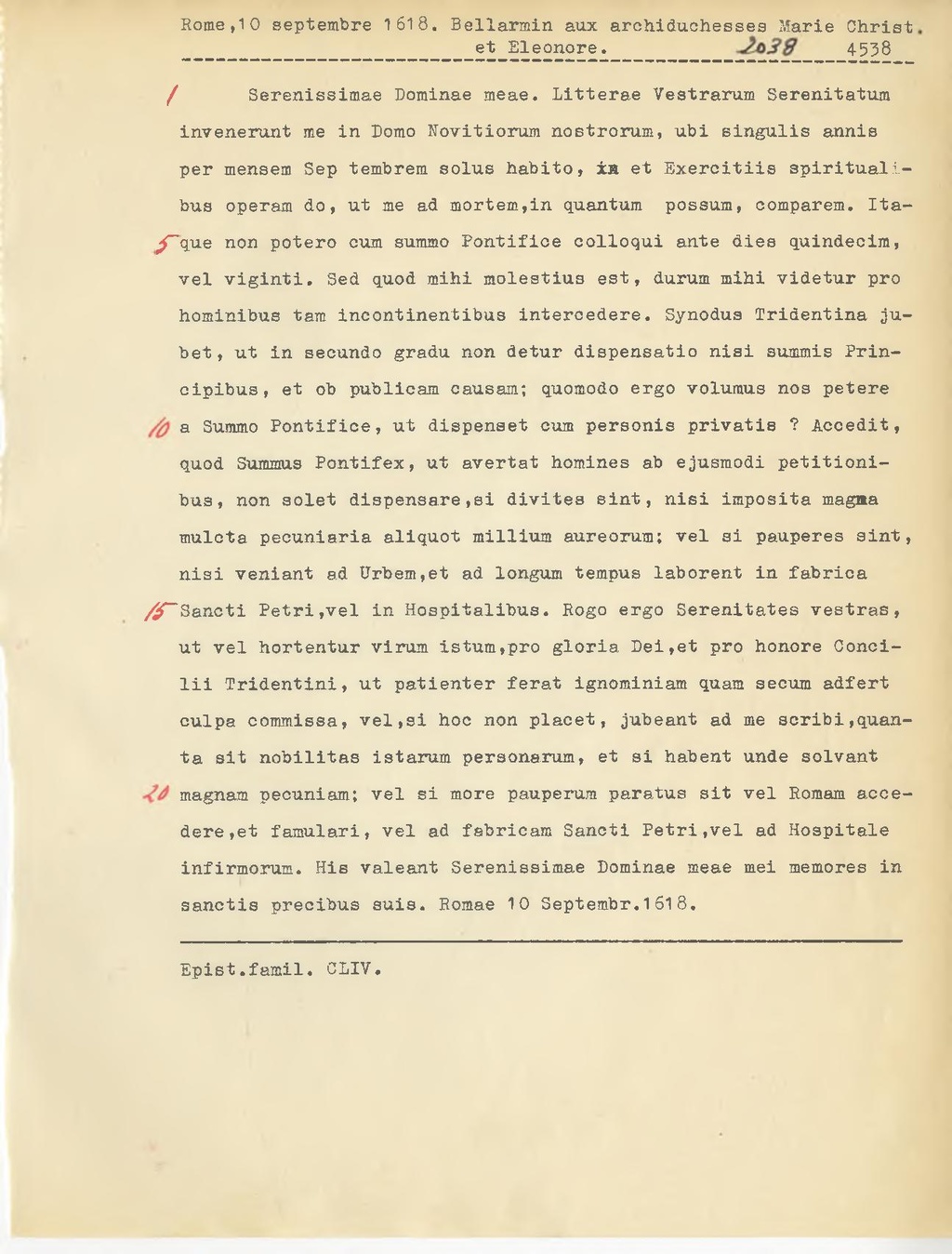 Serenissimae Dominae meae. Litterae Vestrarum Serenitatum invenerunt me in Domo Novitiorum nostrorum, ubi singulis annis per mensem Septembrem solus habito, et Exercitiis spiritualibus operam do, ut me ad mortem,in quantum possum, comparem. Itaque non potero cum summo Pontifica colloqui ante dies quindecim, vel viginti. Sed quod mihi molestine est, durum mihi videtur pro hominibus tam incontinentibus intercedere. Synodus Tridentina jubet, ut in secundo gradu non detur dispensatio nisi summis Principibus, et ob publicam causam; quomodo ergo volumus nos potere a Summo Pontifica, ut dispenset cum personis privatis? Accedit, quod Summus Pontifex, ut avertat homines ab ejusmodi petitionibus, non solet dispensare,si divites sint, nisi imposita magma muleta pecuniaria aliquot millium aureorum; vel si pauperes sint, nisi veniant ad Urbem, et ad longum tempus laborent in fabrica Sancti Patri, vel in Hospitalibus. Rogo ergo Serenitates vestras, ut vel hortentur virum istum, pro gloria Dei, et pro honore Concilii Tridentini, ut patienter ferat ignominiam quam secum adfert culpa commissa, vel, si hoc non placet, jubeant ad me scribi, quanta sit nobilitas istarum personarum, et si habent unde solvant magnam pecuniam; vel si more pauperum paratus sit vel Romam accedere, et famulari, vel ad fabricam Sancti Patri, vel ad Hospitale infirmorum. His valeant Serenissimae Dominae meae mei memores in sanctis precibus suis. Romae 10 Septembr.1618.