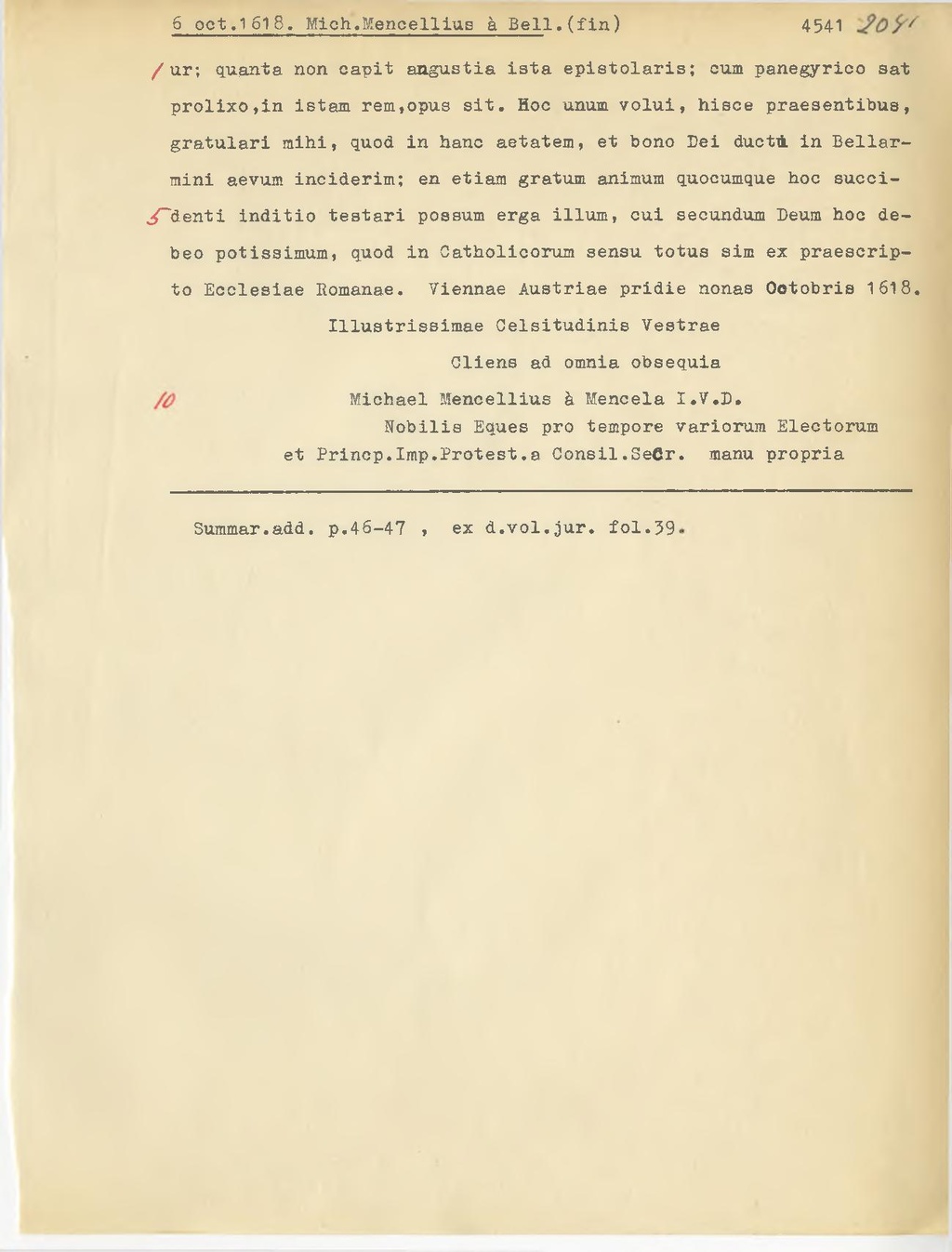 quanta non capit angustia ista epistolaris; cum panegyrico sat prolixo, in istam rem,opus sit. Hoc unum volui, hisce praesentibus, gratulari mihi, quod in hanc aetatem, et bono Dei ductA in Bellarmini aevum inciderim; en etiam gratum animum quocumque hoc succidenti inditio testari possum erga illum, cui secundum Deum hoc de beo potissimum, quod in Catholicorum sensu totus sim ex praescripto Ecclesiae Romanae. Viennae Austriae pridie nonas Octobris 1618.