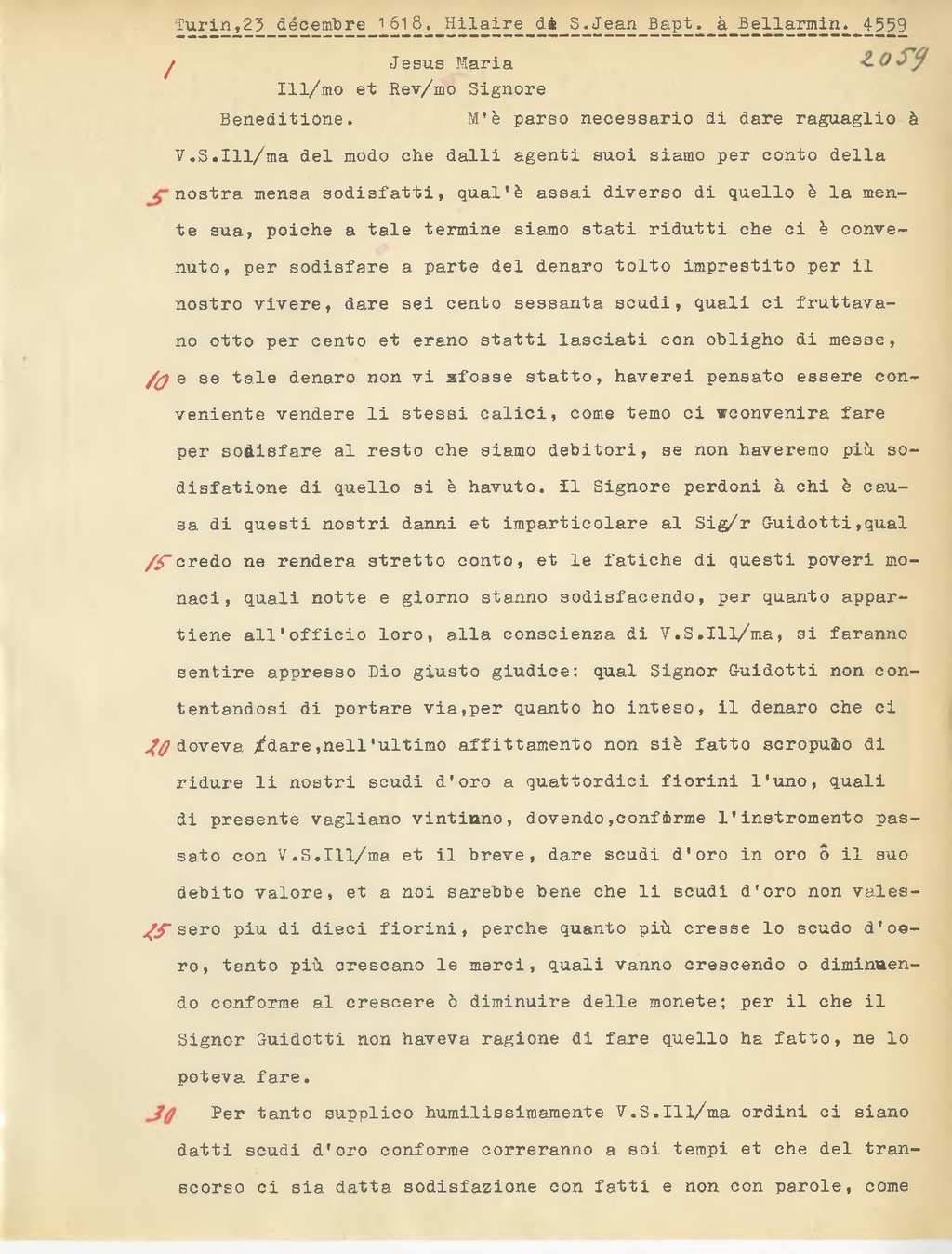 te sua, poichè a tale termine siamo stati ridutti che ci è convenuto, per sodisfare a parte del denaro tolto imprestito per il nostro vivere, dare sei cento sessanta scudi, quali ci fruttavano otto per cento et erano statti lasciati con obligho di messe, e se tale denaro non vi fosse statto, haverei pensato essere conveniente vendere li stessi calici, come temo ci convenira fare per sodisfare al resto che siamo debitori, se non haveremo più sodisfatione di quello si è havuto. Il Signore perdoni à chi è causa di questi nostri danni et imparticolare al Sig.r Guidotti, qual credo ne renderà stretto conto, et le fatiche di questi poveri monaci, quali notte e giorno stanno sodisfacendo, per quanto appartiene all'officio loro, alla conscienza di V.S. Ill.ma, si faranno sentire appresso Dio giusto giudice: qual Signor Guidotti non contentandosi di portare via, per quanto ho inteso, il denaro che ci doveva dare,nell'ultimo affittamento non siè fatto scropulo di