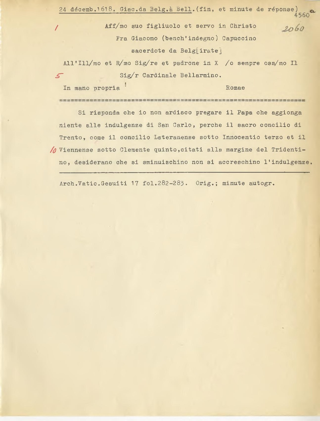 Si risponda che io non ardisco pregare il Papa che aggionga niente alle indulgenze di San Carlo, perche il sacro concilio di Trento, come il concilio Lateranense sotto Innocentio terzo et il Viennense sotto Clemente quinto, citati alla margine del Tridentino, desiderano che si sminuischino non si accreschino l'indulgenze.