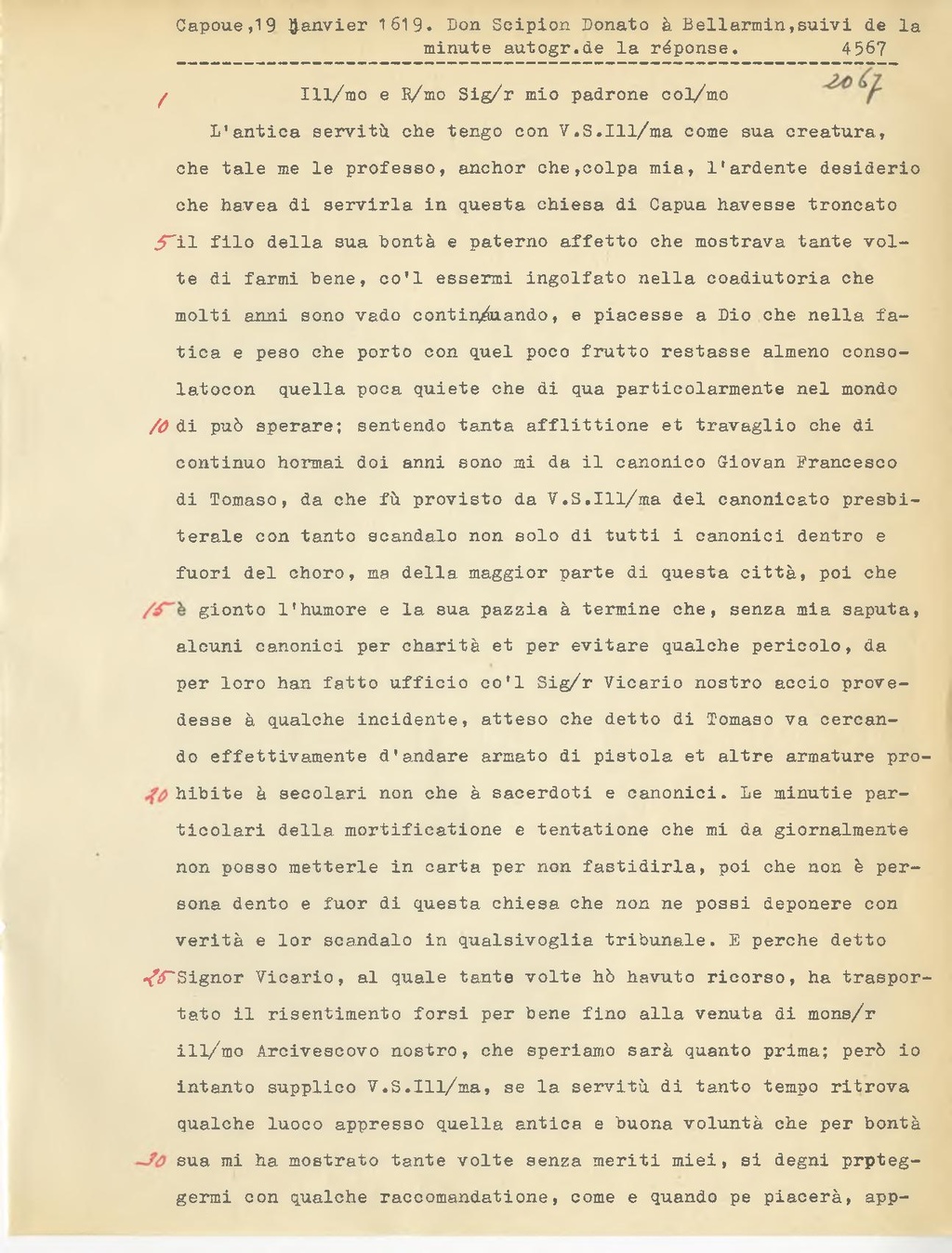 L'antica servitù che tengo con V.S. Ill.ma come sua creatura, che tale me le professo, anchor che, colpa mia, l'ardente desiderio che havea di servirla in questa chiesa di Capua havesse troncato il filo della sua bontà e paterno affetto che mostrava tante volte di farmi bene, co'l essermi ingolfato nella coadiutoria che molti anni sono vado contipando, e piacesse a Dio che nella fatica e peso che porto con quel poco frutto restasse almeno consolato con quella poca quiete che di qua particolarmente nel mondo di può sperare; sentendo tanta afflittione et travaglio che di continuo hormai doi anni sono mi da il canonico Giovan Francesco di Tomaso, da che fù provisto da V.S. Ill.ma del canonicato presbiterale con tanto scandalo non solo di tutti i canonici dentro e fuori del choro, ma della maggior parte di questa città, poi che gionto l'humore e la sua pazzia à termine che, senza mia saputa, alcuni canonici per charità et per evitare qualche pericolo, da per loro han fatto ufficio co'l Sig.r Vicario nostro accio provedesse à qualche incidente, atteso che detto di Tomaso va cercando effettivamente d'andare armato di pistola et altre armature probibite à secolari non che à sacerdoti e canonici. Le minutie particolari della mortificatione e tentatione che mi da giornalmente non posso metterle in carta per non fastidirla, poi che non è persona dento e fuor di questa chiesa che non ne possi deponere con verità e lor scandalo in qualsivoglia tribunale. E perche detto Signor Vicario, al quale tante volte hò havuto ricorso, ha trasportato il risentimento forsi per bene fino alla venuta di mons.r ill.mo Arcivescovo nostro, che speriamo sarà quanto prima; però io intanto supplico V.S. Ill.ma, se la servitù di tanto tempo ritrova qualche luoco appresso quella antica e buona voluntà che per bontà sua mi ha mostrato tante volte senza meriti miei, si degni proteggermi con qualche raccomandatione, come e quando pe piacerà, appresso