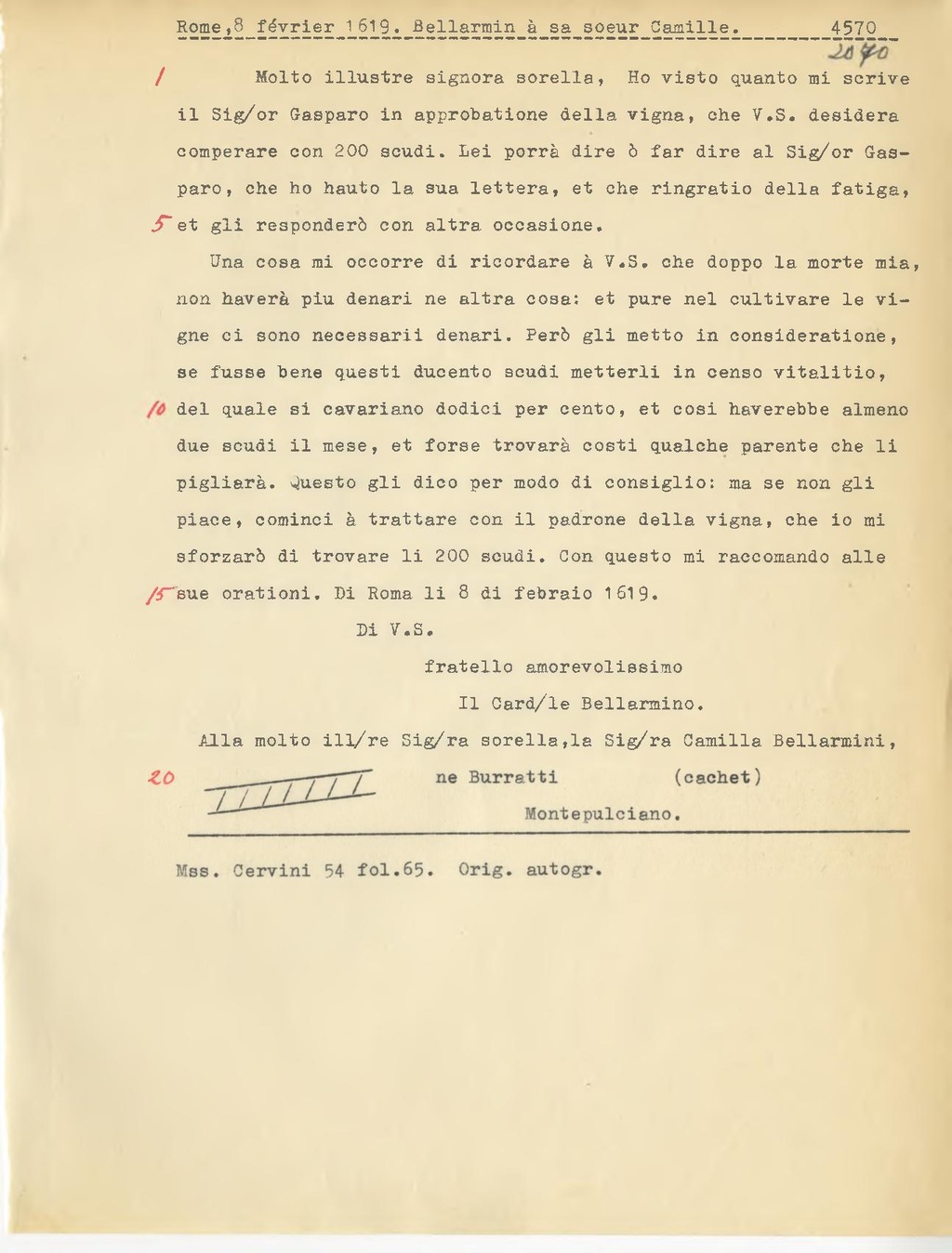 Una cosa mi occorre di ricordare à V.S. che doppo la morte mia, non haverà piu denari ne altra cosa: et pure nel cultivare le vigne ci sono neoessarii denari. Però gli metto in consideratione, se fusse bene questi ducente scudi metterli in censo vitalitio, del quale si cavariano dodici per cento, et cosi haverebbe almeno due scudi il mese, et forse trovarà costi qualche parente che li piglierà. Questo gli dico per modo di consiglio: ma se non gli piace, cominci à trattare con il padrone della vigna, che io mi sforzerò di trovare li 200 scudi. Con questo mi raccomando alle sue orationi. Di Roma li 8 di febraio 1619.
