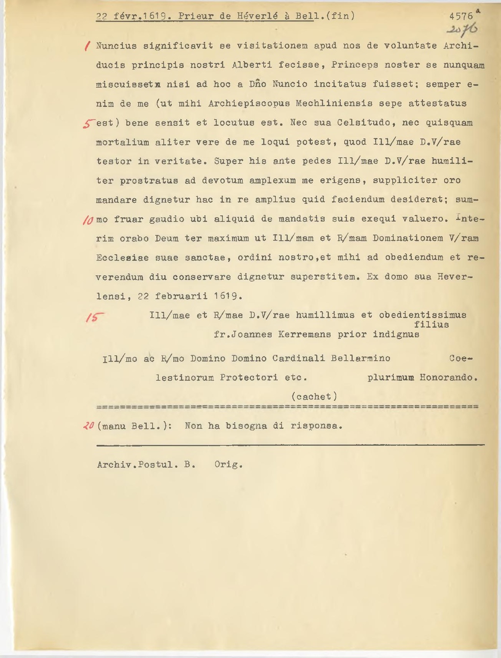 Nuncius significavit se visitationem apud nos de voluntate Archiducis principia nostri Alberti fecisse, Princeps noster se nunquam miacuissetn nisi ad hoc a D.no Nuncio incitatus fuisset; semper enim de me (ut mihi Archiepiscopus Mechliniensis sepe attestatus est) bene sensit et locutus est. Nec sua Celsitudo, nec quisquam mortalium aliter vere de me loqui potest, quod Ill.mae D. V.rae tester in veritate. Super his ante pedes Ill.mae D. V.rae humiliter prostratus ad devotum amplexum me erigens, suppliciter oro mandare dignetur hac in re amplius quid faciendum desiderai; summo fruar gaudio ubi aliquid de mandatis suis exequi valuero. Inte rim orabo Deum ter maximum ut Ill.mam et R.mam Dominationem V.ram Ecclesiae suae sanctae, ordini nostro, et mlhi ad obediendum et reverendum diu conservare dignetur superstitem. Ex domo sua Heverlensi, 22 februarii 1619.