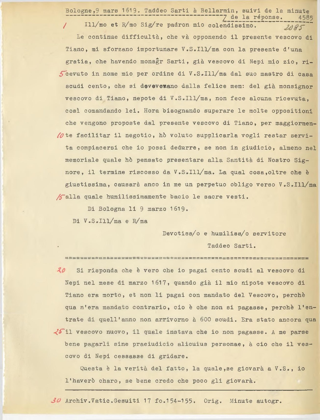 Si risponda che è vero che io pagai cento scudi al vescovo di Nepi nel mese di marzo 1617, quando già il mio nipote vescovo di Tiano era morto, et non li pagai con mandato del Vescovo, perchè qua n'era mandato contrario, ciò è che non si pagasse, perchè l'entrate di quell'anno non arrivorno à 600 scudi. Era stato ancora qua il vescovo nuovo, il quale instava che io non pagasse. A me parse bene pagarli sine praeiudicio alicuius personae, a cio che il vescovo di Nepi cessasse di gridare.