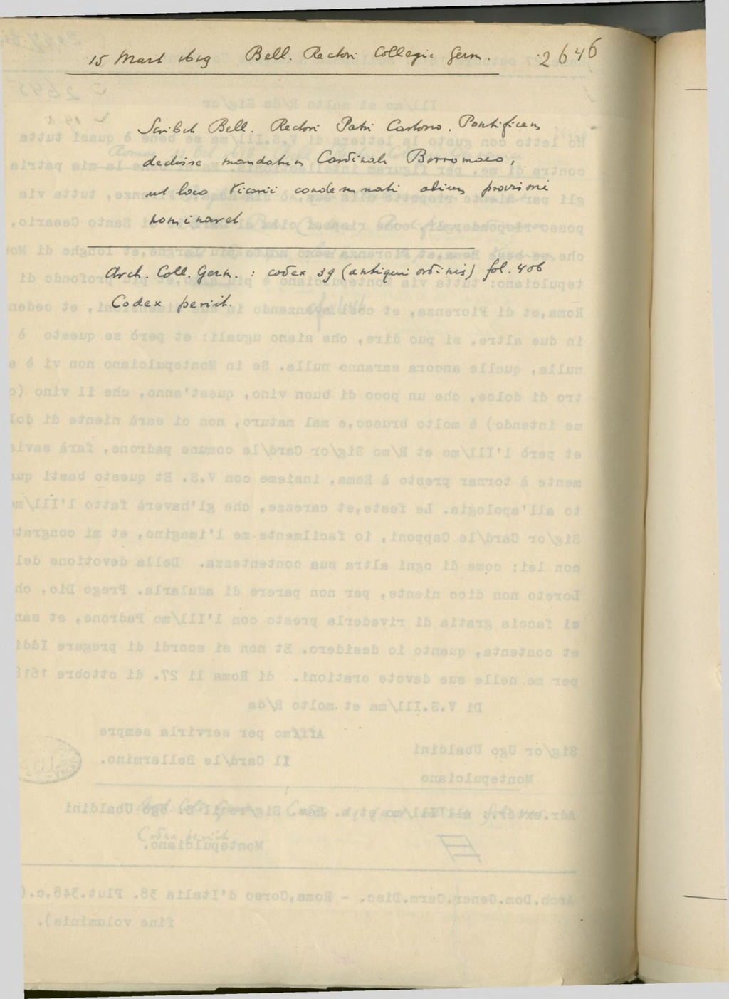 Scribet Bell. Rectori Petri Castorio. Pontificem dedisse mandatum Cardinali Borromeo, ut loco Vicariii condammati alius provisisioni nominaret.