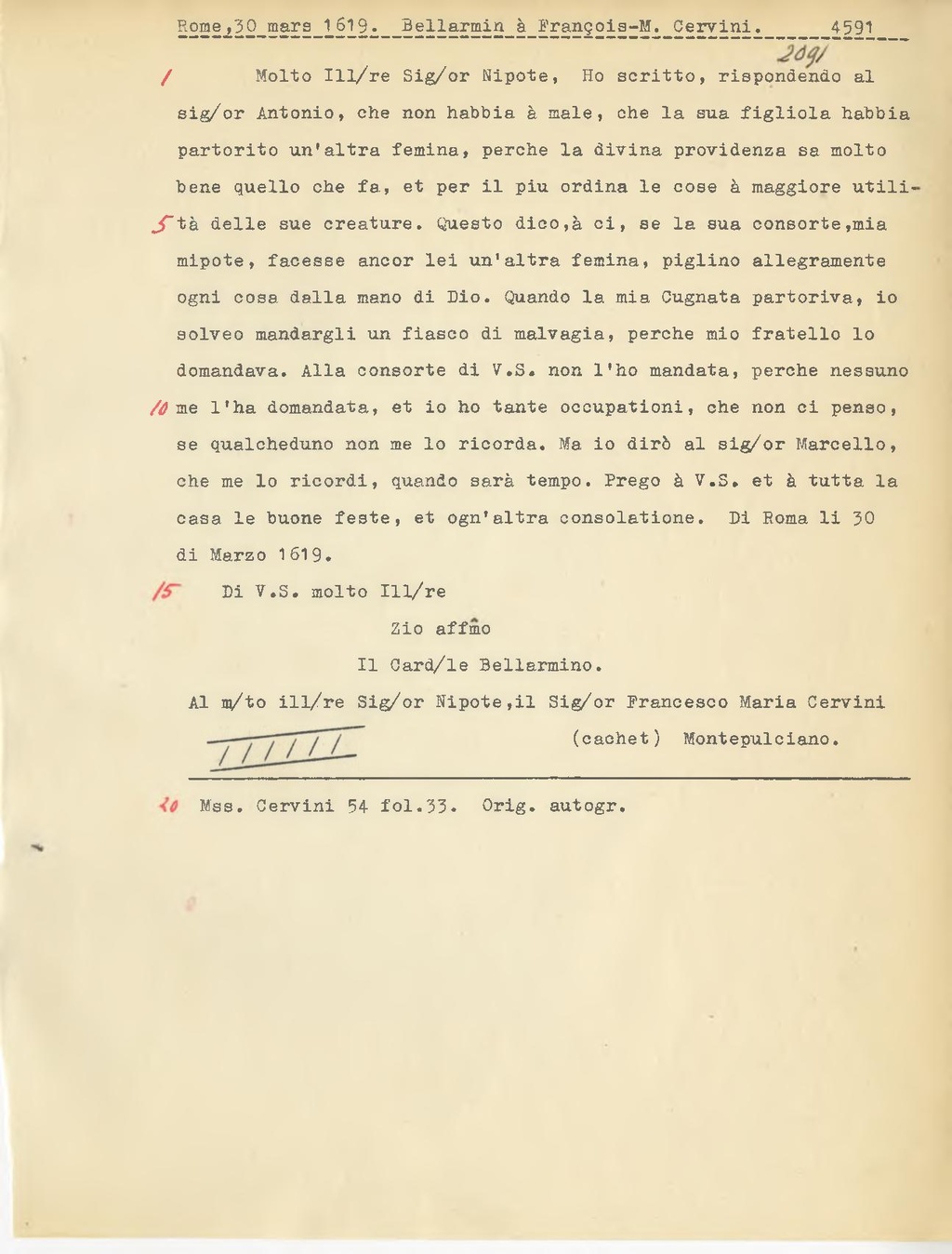 Molto Ill.re Sig.or Nipote, Ho scritto, rispondendo al sig.or Antonio, che non habbia à male, che la sua figliola habbia partorito un'altra femina, perche la divina previdenza sa molto bene quello che fa, et per il piu ordina le cose à maggiore utilità delle sue creature. Questo dico, à ci, se la sua consorte, mia mipote, facesse ancor lei un'altra femina, piglino allegramente ogni cosa dalla mano di Dio. Quando la mia Cugnata partoriva, io solveo mandargli un fiasco di malvagia, perche mio fratello lo domandava. Alla consorte di V.S. non l'ho mandata, perche nessuno me l'ha domandata, et io ho tante occupationi, che non ci penso, se qualcheduno non me lo ricorda. Ma io dirò al sig.or Marcello, che me lo ricordi, quando sarà tempo. Prego à V.S. et à tutta la casa le buone feste, et ogn'altra consolatione. Di Roma li 30 di Marzo 1619.