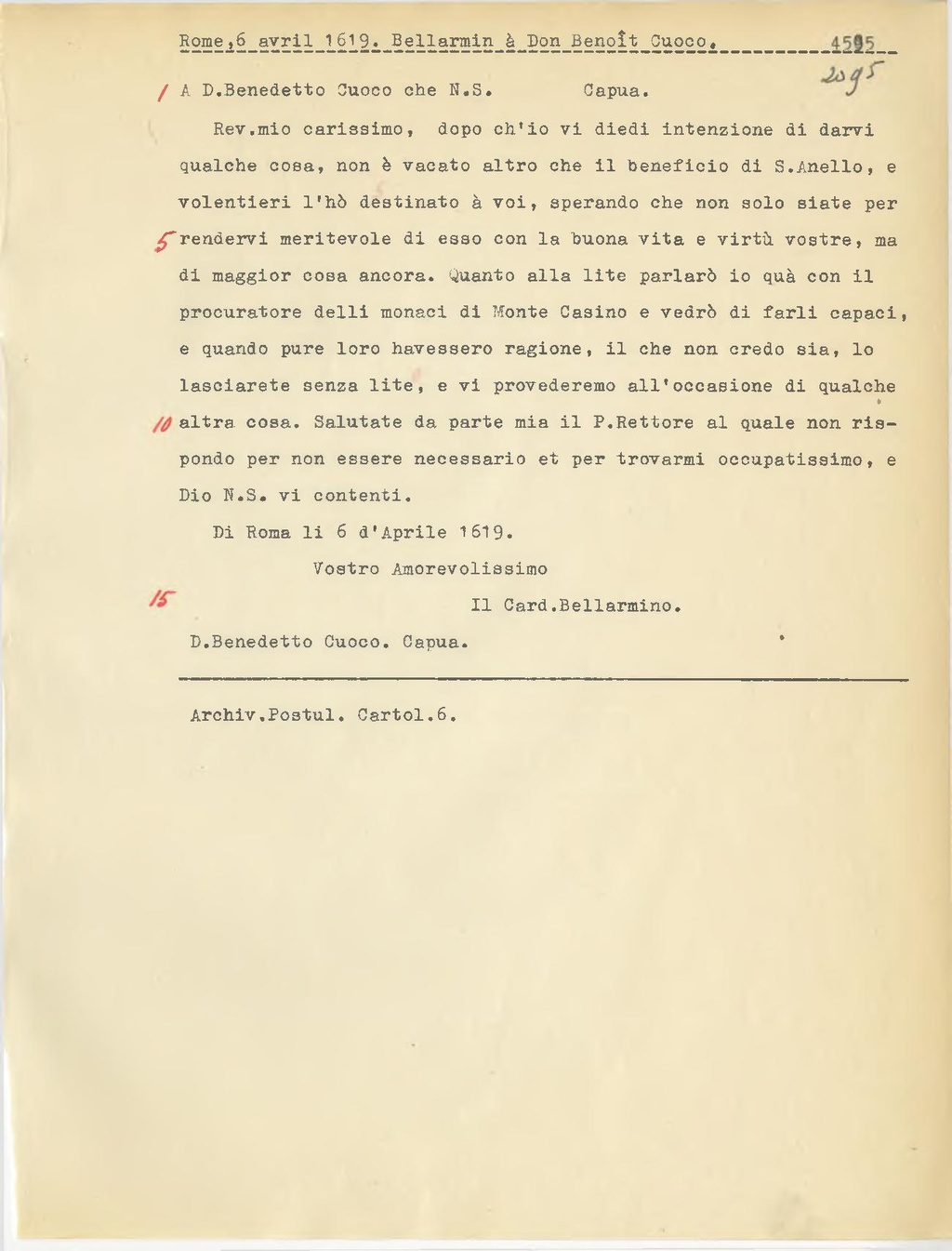 qualche cosa, non è vacato altro che il beneficio di S.Anello, e volentieri l'hò destinato à voi, sperando che non solo siate per rendervi meritevole di esso con la buona vita e virtù vostre, ma di maggior cosa ancora. Quanto alla lite parlarò io quà con il procuratore dalli monaci di Monte Casino e vedrò di farli capaci, e quando pure loro bevessero ragione, il che non credo sia, lo lascierete senza lite, e vi provederemo all'occasione di qualche