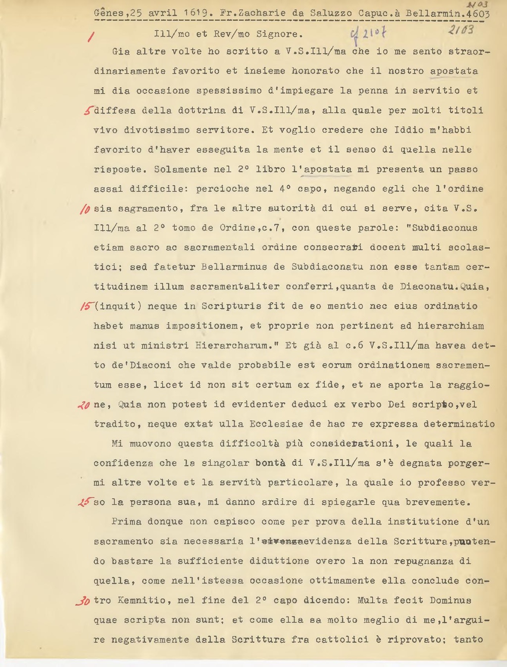 Gia altre volte ho scritto a V.S. Ill.ma che io me sento straordinariamente favorito et insieme honorato che il nostro apostata mi dia occasione spessissimo d'impiegare la penna in servitio et diffesa della dottrina di V.S. Ill.ma, alla quale per molti titoli vivo divotissimo servitore. Et voglio credere che Iddio m'habbi favorito d'haver esseguita la mente et il senso di quella nelle risposte. Solamente nel 2° libro l'apostata mi presenta un passo assai difficile: percioche nel 4° capo, negando egli che l'ordine sia sagramento, fra le altre autorità di cui si serve, cita V.S. Ill.ma al 2° tomo de Ordine, c.7, con queste parole: "Subdiaconus etiam sacro ac sacramentali ordine consacraci docent multi scolas tici; sed fatetur Bellarminus de Subdiaconatu non esse tantam certitudinem illum sacramentaliter conferri,quanta de Diaconatu. Quia,(inquit) neque in Scripturis fit de eo mentio nec eius ordinario habet manus impositionem, et proprie non pertinent ad hierarchiam nisi ut ministri Hierarcharum". Et già al c.6 V.S. Ill.ma havea detto de'Diaconi che valde probabile est eorum ordinationem sacramentum esse, licet id non sit certum ex fide, et ne aporta la raggione. Quia non potest id evidenter deduci ex verbo Dei scripto, vel tradito, neque extat ulla Ecclesiae de hac re expressa determinatio