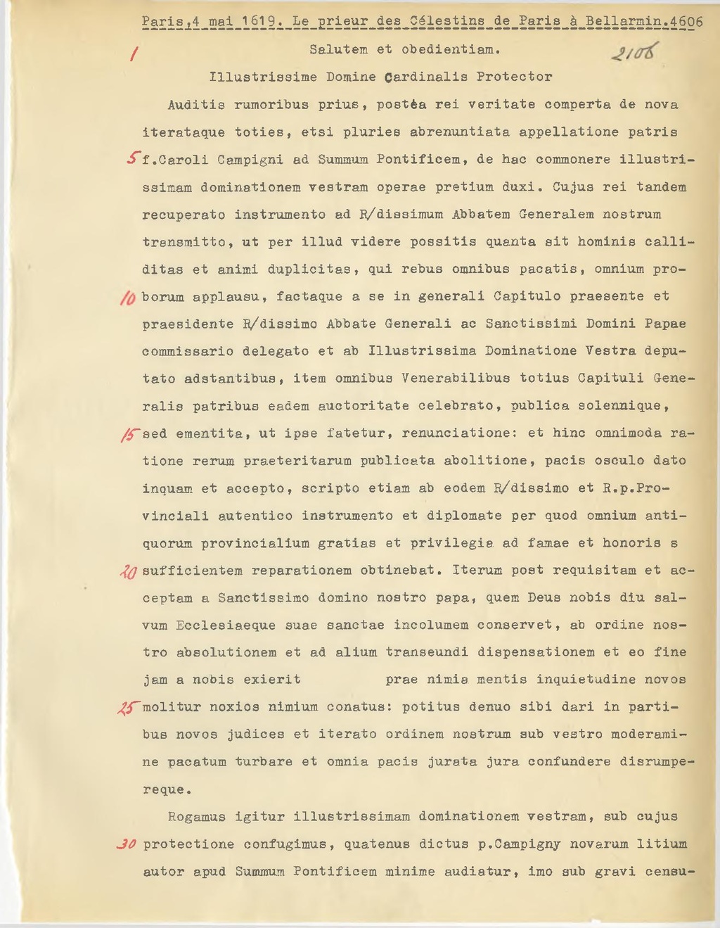 Auditis rumoribus prius, postea rei veritate comperta de nova iterataque toties, etsi pluries abrenuntiata appellatione patris f.Caroli Campigni ad Summum Pontificem, de hac commonere illustrissimam dominationem vestram operae pretium duxi. Cujus rei tandem recuperato instrumento ad R.dissimum Abbatem Generalem nostrum transmitto, ut per illud videre possitis quanta sit hominis calliditas et animi duplicitas, qui rebus omnibus pacatis, omnium proborum applausu, factaque a se in generali Capitalo praesente et praesidente R.dissimo Abbate Generali ac Sanctissimi Domini Papae commissario delegato et ab Illustrissima Dominatione Vestra deputato adstantibus, item omnibus Venerabilibus totius Capitali Generalis patribus eadem auctoritate celebrato, publica solennique, sed smentita, ut ipse fatetur, renunciatione: et hinc omnimoda ratione rerum praeteritarum publicata abolitione, pacis osculo dato inquam et accepto, scripto etiam ab eodem R.dissimo et R.p. Provinciali autentico instrumento et diplomate per quod omnium antiquorum provincialium gratias et privilegia ad famae et honoris sufficientem reparationem obtinebat. Iterum post requisitam et acceptam a Sanctissimo domino nostro papa, quem Deus nobis diu salvum Ecclesiaeque suae sanctae incolumem conservet, ab ordine nostro absolutionem et ad alium transeundi dispensationem et eo fine jam a nobis exierit prae nimia mentis inquietudine novos molitur noxios nimium conatus: potitus denuo sibi dari in partibus novos judices et iterato ordinem nostrum sub vostro moderamine pacatum turbare et omnia pacis jurata jura contundere disrumpereque. Rogamus igitur illustrissimam dominationem vestram, sub cujus protectione confugimus, quatenus dictus p. Campigny novarum litium