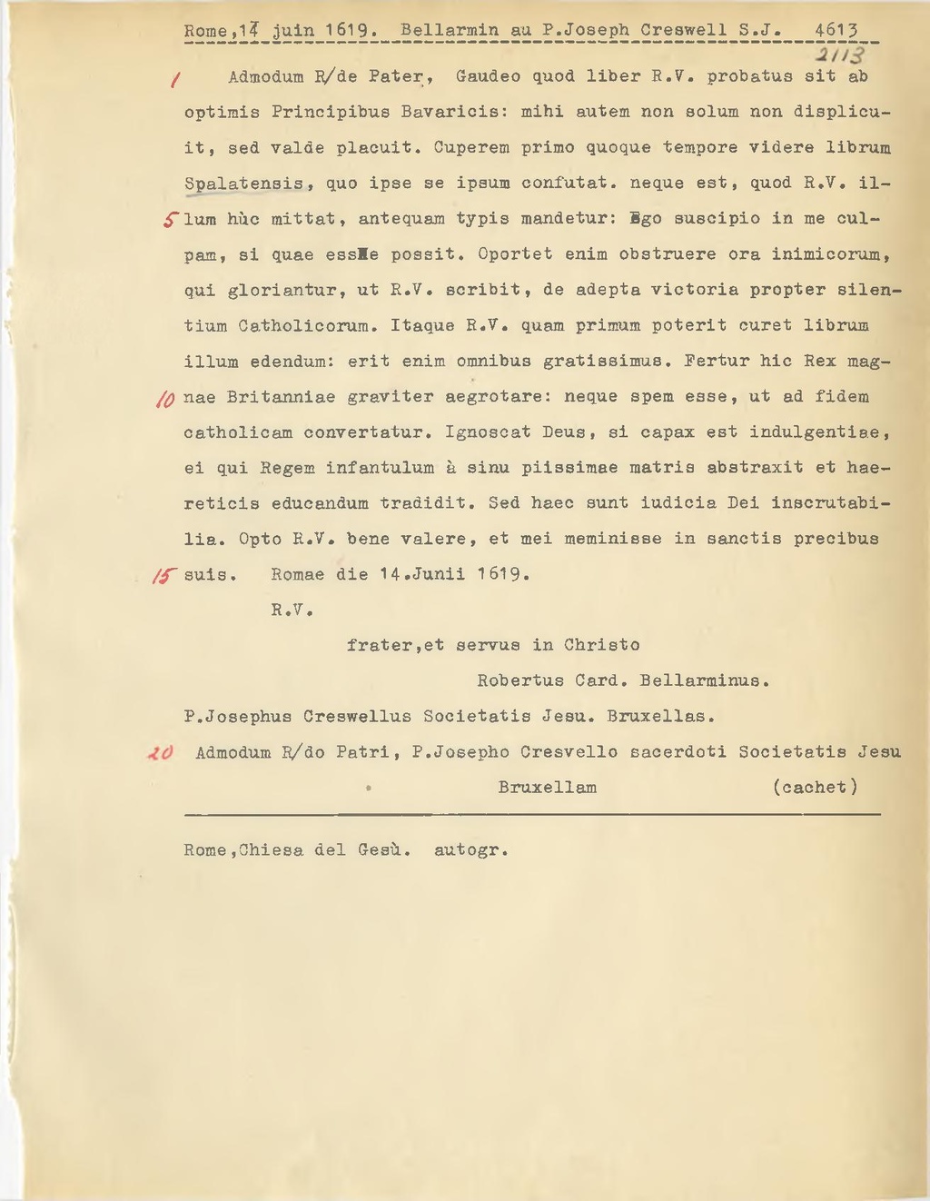 illum edendum: erit enim omnibus gratissimus. Fertur hic Rex magnae Britanniae gravitar aegrotare: neque spem esse, ut ad fidem atholicam convertatur. Ignoscat Deus, si capax est indulgentiae, ei qui Regem infantulum à sinu piissimae matris abstraxit et haereticis educandum tradidit. Sed haec sunt fudicia Dei inscrutabilia. Opto R.V. bene valere, et mei meminisse in sanctis precibus suis. Romae die 14. Junii 1619.