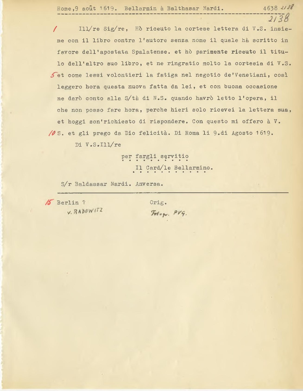 Ill.re Sig.re, Hò riceuto la cortese lettera di V.S. insieme con il libro contra l'autore senza nome il quale ha scritto in favore dell'apostata Spalatense. et hò parimente riceuto il titulo dell'altro suo libro, et ne ringratio molto la cortesia di V.S. et come lessi volentieri la fatiga nel negotio de' Venetiani, così leggero hora questa nuova fatta da lei, et con buona occasione ne darò conto alla S.tà di N.S. quando havrò letto l'opera, il che non posso fare hora, perche hieri solo ricevei la lettera sua, et hoggi son'richiesto di rispondere. Con questo mi offero à V.S. et gli prego da Dio felicità. Di Roma li 9. di Agosto 1619.