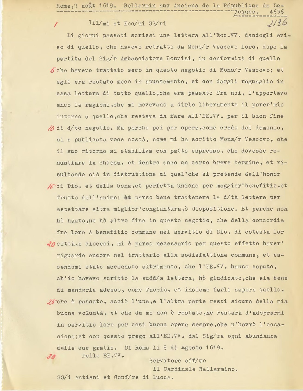 intorno a quello, che restava da fare all'EE.VV. per il buon fine di d.to negotio. Ma perche poi per opera,come credo del demonio, si e publicata voce costà, come mi ha scritto Mons.r Vescovo, che il suo ritorno si stabiliva con patto espresso, che dovesse renuntiare la chiesa, et dentro anco un certo breve termine, et risultando ciò in distruttione di quel'che si pretende dell'honor di Dio, et della bona, et perfetta unione per maggior'benefitio, et frutto dell'anime; parso bene trattenere la d.tà lettera per aspettare altra miglior'congiuntura, ò dispositione. Et perche non hò hauto, ne hò altro fine in questo negotio, che della concordia fra loro à benefitio commune nel servitio di Dio, di cotesta lor città, e diocesi, mi è parso necessario per questo effetto haver' riguardo ancora nel trattarlo alla sodisfattione commune, et essendomi stato accennato altrimente, che l'EE.VV. hanno saputo, ch'io havevo scritto la sudd.a lettera, hò giudicato, che sia bene di mandarla adesso, come faccio, et insieme farli sapere quello, che è passato, acciò l'una,e l'altra parte resti sicura della mia buona voluntà, et che da me non è restato, ne restarò d'adoprarmi in servitio loro per cosi buona opera sempre, che n'havrò l'occasione; et con questo prego all'EE.VV. dal Sig.re ogni abundanza delle sue gratie. Di Roma li 9 di Agosto 1619.