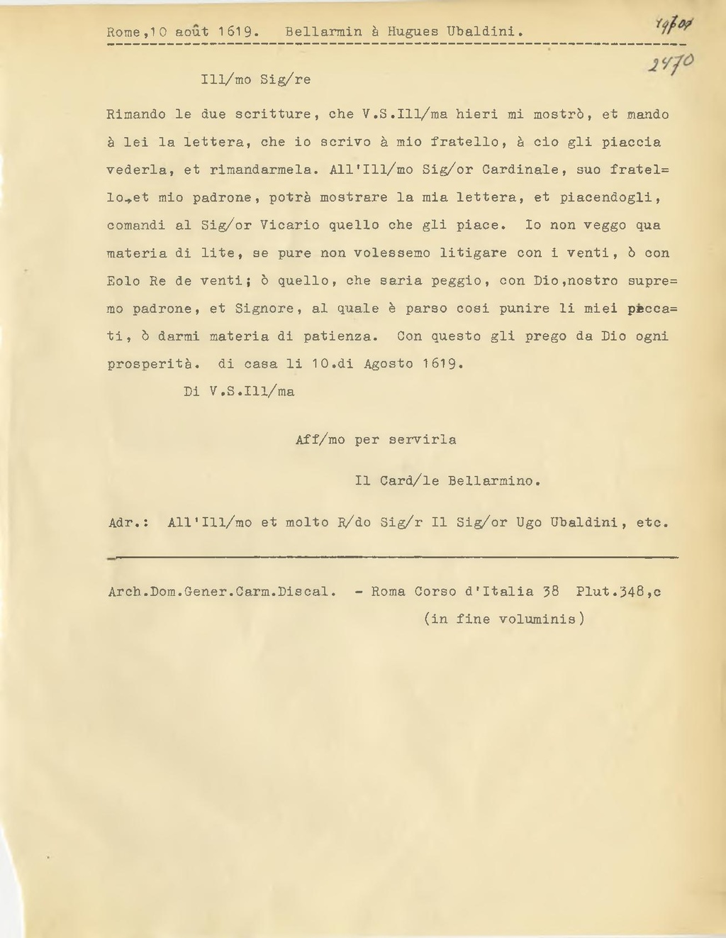Rimando le due scritture, che V.S. Ill.ma hieri mi mostrò, et mando à lei la lettera, che io scrivo à mio fratello, à ciò gli piaccia vederla, et rimandarmela. All'Ill.mo Sig.or Cardinale, suo fratello et mio padrone, potrò mostrare la mia lettera, et piacendogli, comandi al Sig.or Vicario quello che gli piace. Io non veggo qua materia di lite, se pure non volessemo litigare con i venti, ò con Eolo Re de venti; ò quello, che saria peggio, con Dio,nostro supremo padrone, et Signore, al quale è parso cosi punire li miei piccati, ò darmi materia di patienza. Con questo gli prego da Dio ogni prosperità, di casa li 10. di Agosto 1619.