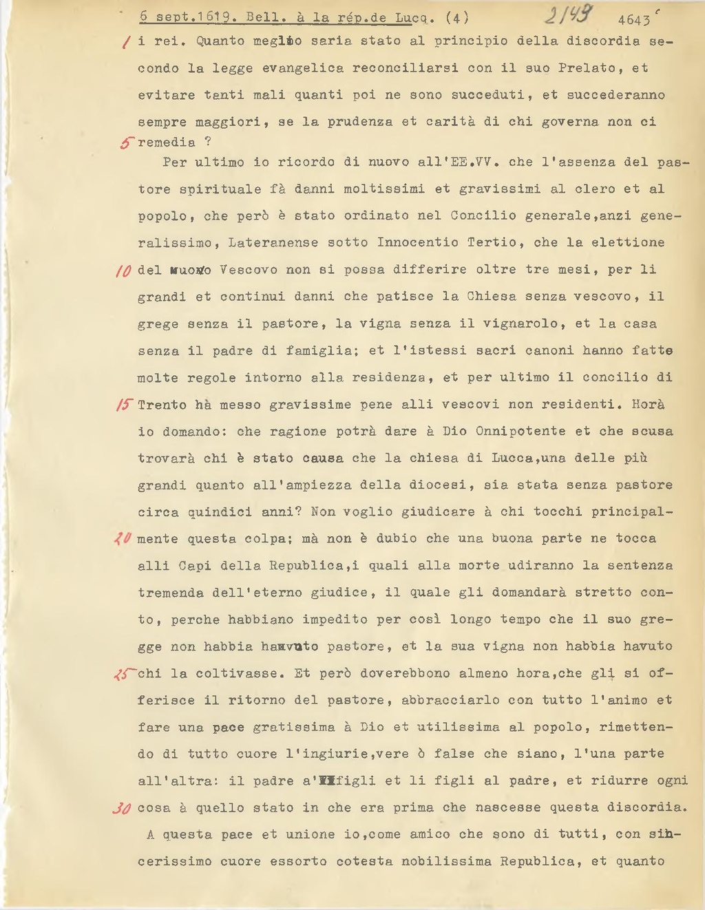 molte regole intorno alla residenza, et per ultimo il concilio di Trento ha messo gravissime pene alli vescovi non residenti. Horà io domando: che ragione potrà dare à Dio Onnipotente et che scusa troverà chi è stato causa che la chiesa di Lucca, una delle più grandi quanto all'ampiezza della diocesi, sia stata senza pastore
