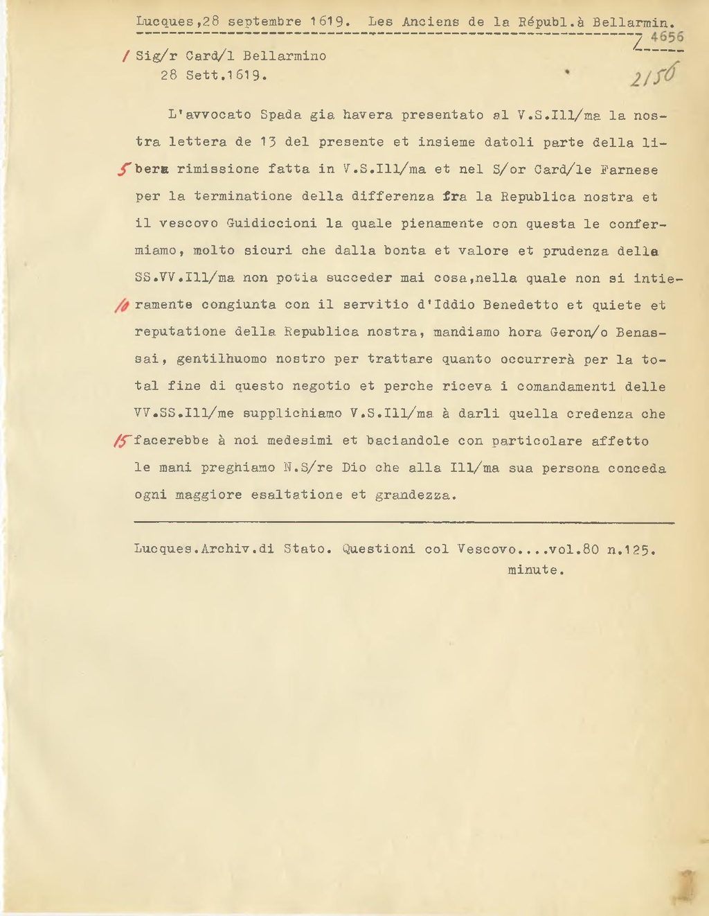 L'avvocato Spada già havera presentato al V.S. Ill.ma la nostra lettera de 13 del presente et insieme datoli parte della libera rimissione fatta in V.S. Ill.ma et nel S.or Card.le Farnese per la terminatione della differenza fra la Republica nostra et il vescovo Guidiccioni la quale pienamente con questa le confermiamo, molto sicuri che dalla bontà et valore et prudenza della SS.VV. Ill.ma non potia succeder mai cosa, nella quale non si intieramente congiunta con il servitio d'iddio Benedetto et quiete et reputatione della Republica nostra, mandiamo bora Geron.o Benassai, gentilhuomo nostro per trattare quanto occurrerà per la total fine di questo negotio et perche riceva i comandamenti delle VV.SS. Ill.me supplichiamo V.S. Ill.ma à darli quella credenza che facerebbe à noi medesimi et baciandole con particolare affetto le mani preghiamo N. S.re Dio che alla Ill.ma sua persona conceda ogni maggiore esaltatione et grandezza.
