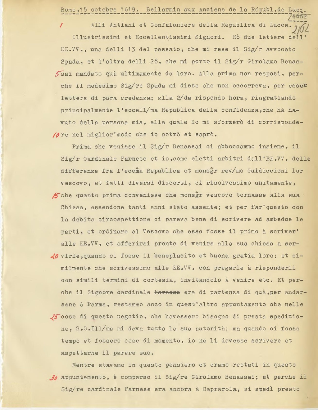 Prima che venisse il Sig.r Benassai ci abboccammo insieme, il Sig.r Cardinale Farnese et io, come eletti arbitri dall'EE.VV. delle differenze fra l'ecc.ma Republica et monsgr rev.mo Guidiccioni lor vescovo, et fatti diversi discorsi, ci risolvessimo unitamente, che quanto prima convenisse che mons.gr vescovo tornasse alla sua Chiesa, essendone tanti anni stato assente; et per far'questo con la debita circospettione ci pareva bene di scrivere ad ambedue le parti, et ordinare al Vescovo che esso fosse il primo à scriver' alle EE.VV. et offerirsi pronto di venire alla sua chiesa a servirle, quando ci fosse il beneplacito et buona gratia loro; et similmente che scrivessimo alle EE.VV. con pregarle à risponderli con simili termini di cortesia, invitandolo à venire etc. Et per che il Signore cardinale era di partenza di quà, per andarsene à Parma, restammo anco in quest'altro appuntamento che nelle cose di questo negotio, che bevessero bisogno di presta speditione, S.S. Ill.ma mi dava tutta la sua autorità; ma quando ci fosse tempo et fossero cose di momento, io ne li dovesse scrivere et aspettarne il parere suo.