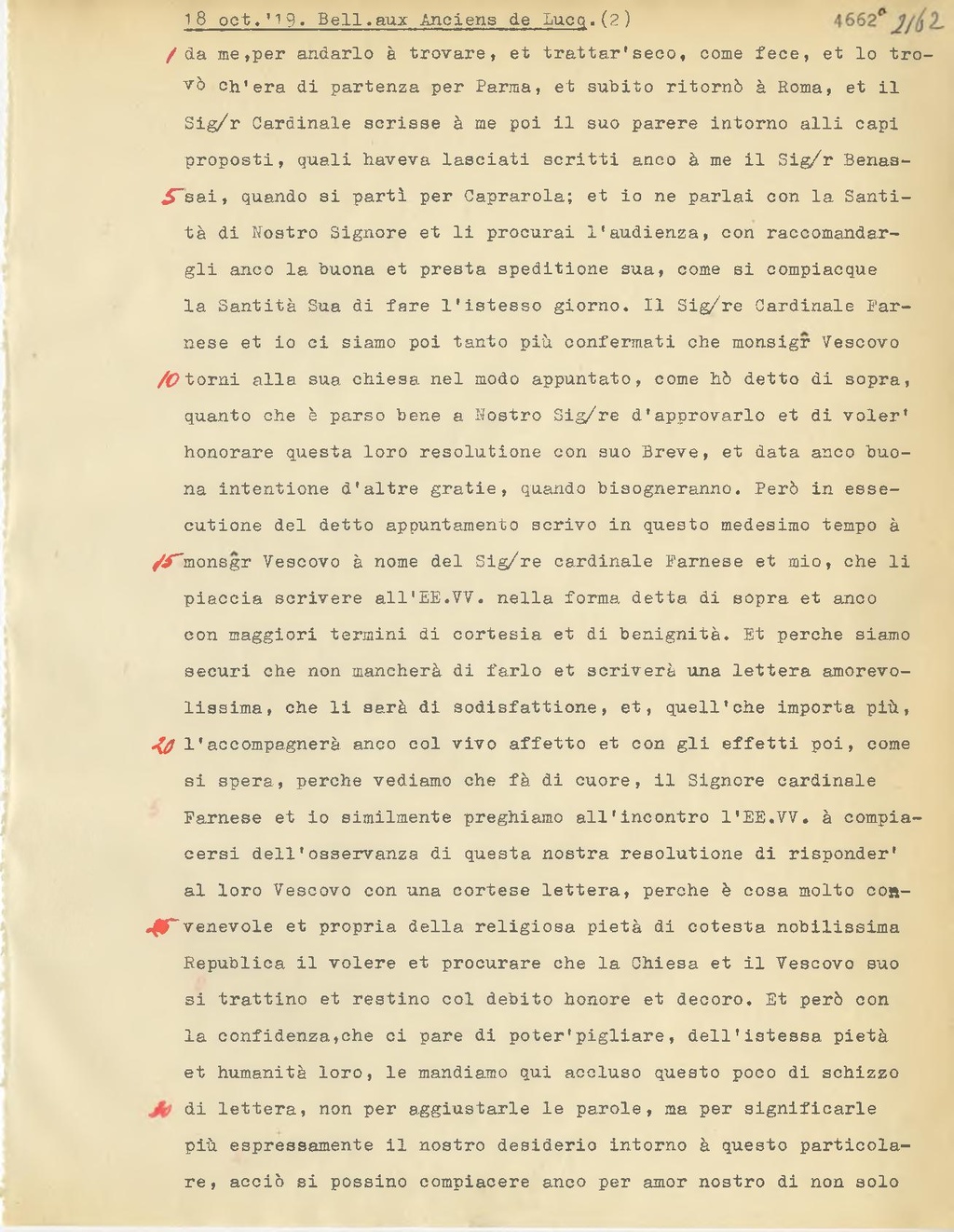 Farnese et io similmente preghiamo all'incontro l'EE. VV. à compiacersi dell'osservanza di questa nostra resolutione di risponder' al loro Vescovo con una cortese lettera, perche è cosa molto convenevole et propria della religiosa pietà di cotesta nobilissima Republica il volere et procurare che la Chiesa et il Vescovo suo si trattino et restino col debito honore et decoro. Et però con la confidenza,che ci pare di poter'pigliare, dell'istessa pietà et humanità loro, le mandiamo qui accluso questo poco di schizzo di lettera, non per aggiustarle le parole, ma per significarle più espressamente il nostro desiderio intorno à questo particolare, acciò si possine compiacere anco per amor nostro di non solo