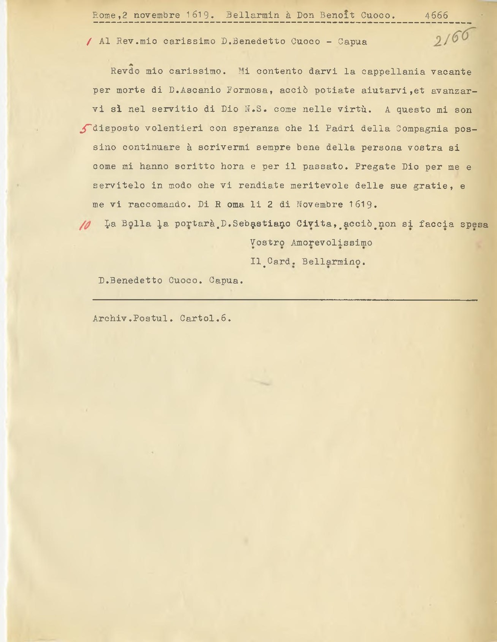 Rev.do mio carissimo. Mi contento darvi la cappellania vacante per morte di D.Ascanio Formosa, acciò potiate aiutarvi, et avanzarvi sì nel servitio di Dio N.S. come nelle virtù. A questo mi son disposto volentieri con speranza ohe li Padri della Compagnia possine continuare à scrivermi sempre bene della persona vostra si come mi hanno scritto bora e per il passato. Pregate Dio per me e servitelo in modo che vi rendiate meritevole delle sue gratie, e me vi raccomando. Di Roma li 2 di Novembre 1619.