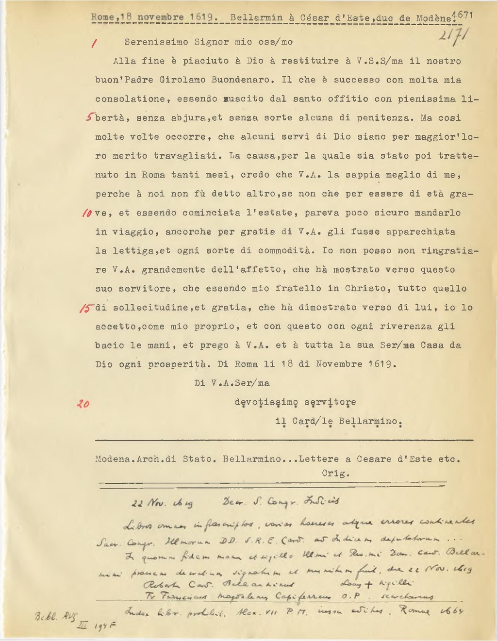 Alla fine è piaciuto à Dio à restituire à V.S. S.ma il nostro buon' Padre Girolamo Buondenaro. Il che è successo con molta mia consolatione, essendo zuscito dal santo offitio con pienissima libertà senza abjura, et senza sorte alcuna di penitenza. Ma cosi molte volte occorre, che alcuni servi di Dio siano per maggior'loro merito travagliati. La causa, per la quale sia stato poi trattenuto in Roma tanti mesi, credo che V.A. la sappia meglio di me, perche à noi non fù detto altro, se non che per essere di et grave, et essendo cominciata l'estate, pareva poco sicuro mandarlo in viaggio, ancorchè per gratia di V.A. gli fusse apparechiata la lettiga, et ogni sorte di commodità. Io non posso non ringratiare V.A. grandemente dell'affetto, che hò mostrato verso questo suo servitore, che essendo mio fratello in Christo, tutto quello di sollecitudine, et gratia, che hà dimostrato verso di lui, io lo accetto,come mio proprio, et con questo con ogni riverenza gli bacio le mani, et prego à V.A. et è tutta la sua Ser.ma Casa da Dio ogni prosperità. Di Roma li 18 di Novembre 1619.