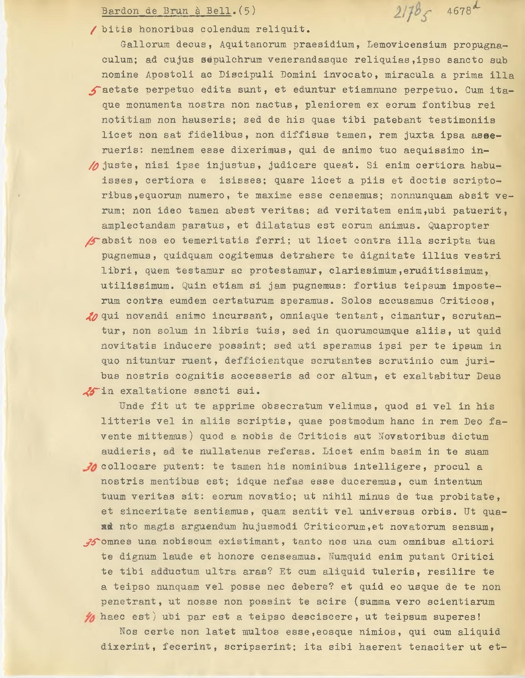 Gallorum decus, Aquitanorum praesidium, Lemovicensium propugnaculum; ad cujus sepulchrum venerandasque reliquias, ipso sancto sub nomine Apostoli ac Discipuli Domini invocato, miracula a prima illa aetate perpetuo edita sunt, et eduntur etiamnunc perpetuo. Cum itaque monumenta nostra non nactus, pleniorem ex eorum fontibus rei notitiam non hauseris; sed de his quae tibi patebant testimoniis licet non sat fidelibus, non diffisus tamen, rem juxta ipsa asserueris: neminem esse dixerimus, qui de animo tuo aequissimo injuste, nisi ipse injustus, judicare queat. Si enim certiora habuisses, certiora e isisses; quare licet a piis et doctis scriptoribus, equorum numero, te maxime esse censemus; nonnunquam absit verum; non ideo tamen abest veritas; ad veritatem enim,ubi patuerit, amplectandam paratus, et dilatatus est eorum animus. Quapropter absit nos eo temeritatis ferri; ut licet contra illa scripta tua pugnemus, quidquam cogitemus detrahere te dignitate illius vestri libri, quem testamur ac protestamur, clarissimum, eruditissimum, utilissimum. Quin etiam si jam pugnemus: fortius te ipsum imposterum contra eumdem certaturum speramus. Solos accusamus Criticos, qui novandi animo incursant, omniaque tentant, cimantur, scrutantur, non solum in libris tuis, sed in quorumeumque aliis, ut quid novitatis inducere possint; sed uti speramus ipsi per te ipsum in quo nituntur ruent, defficientque scrutantes scrutinio cum juribus nostris cognitis accessorie ad coraltum, et exaltabitur Deus in exaltatione sancti sui.