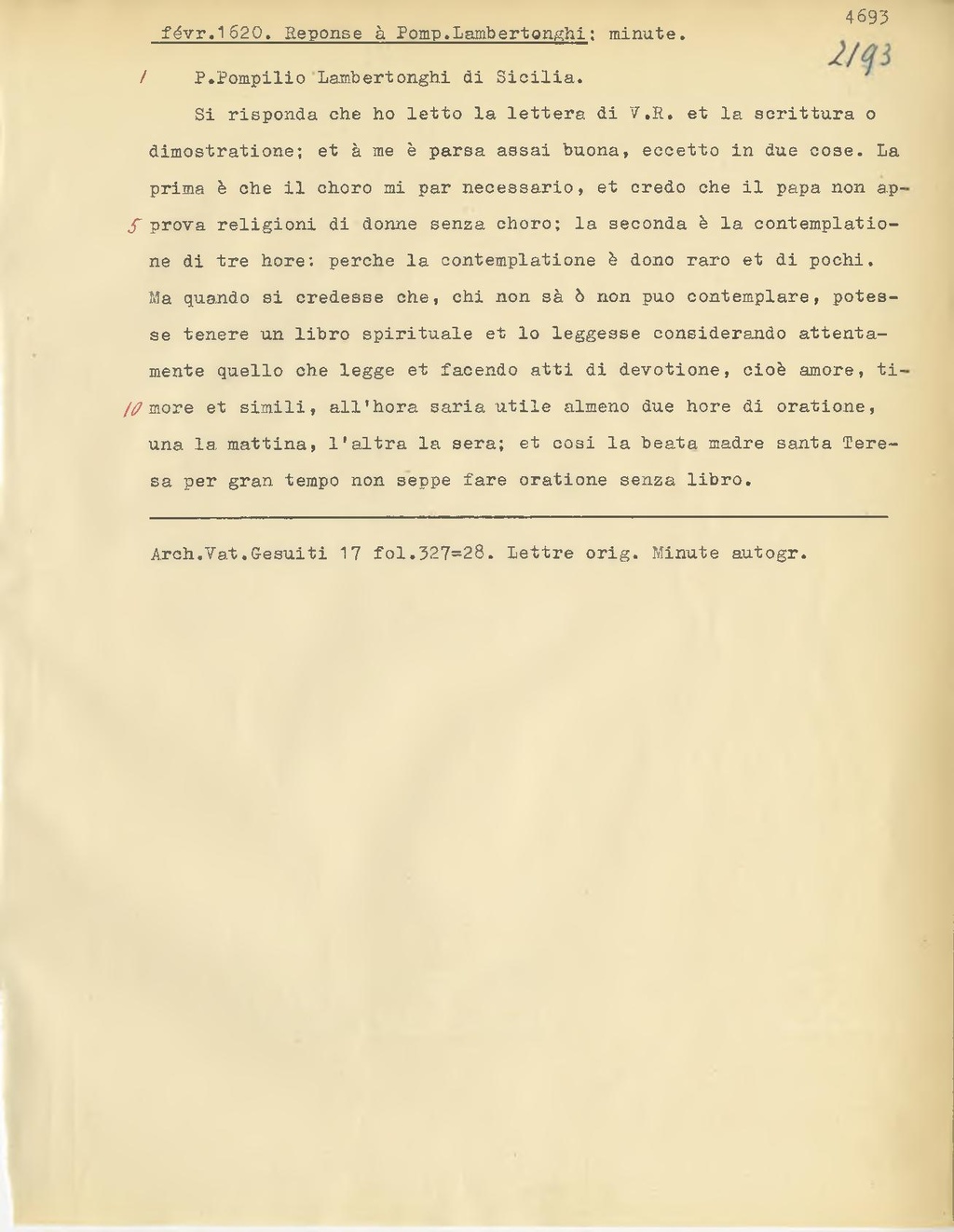 Si risponda che ho letto la lettera di V.R. et la scrittura o dimostratione; et à me è parsa assai buona, eccetto in due cose. La prima è che il choro mi par necessario, et credo che il papa non approva religioni di donne senza choro; la seconda è la contemplatione di tre hore: perche la contemplatione è dono raro et di pochi. Ma quando si credesse che, chi non sà ò non può contemplare, potesse tenere un libro spirituale et lo leggesse considerando attentamente quello che legge et facendo atti di devotione, cioè amore, timore et simili, all'hora saria utile almeno due hore di oratione, una la mattina, l'altra la sera; et cosi la beata madre santa Teresa per gran tempo non seppe fare oratione senza libro.