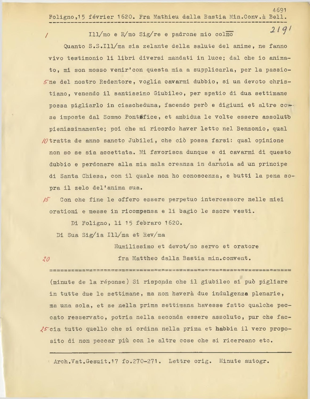 (minute de la rèponse) Si risponda che il giubileo si può pigliare in tutte due le settimane, ma non haverà due indulgenza plenarie, ma una sola, et se nella prima settimana havesse fatto qualche peccato resservato, potria nella seconda essere assoluto, pur che faccia tutto quello che si ordina nella prima et habbia il vero propo sito di non peccar più con le altre cose che si ricercano etc.