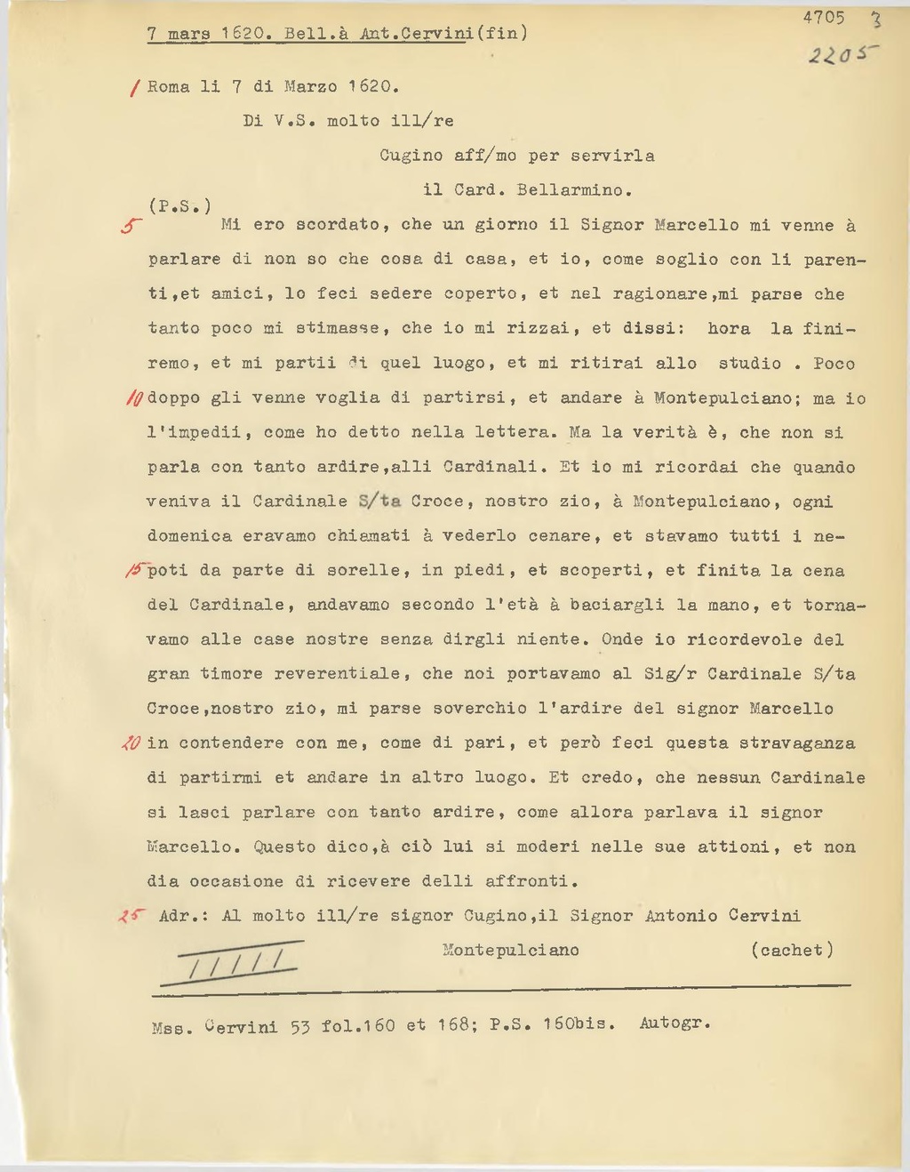 Mi ero scordato, che un giorno il Signor Marcello mi venne à parlare di non so che cosa di casa, et io, come soglio con li parenti, et amici, lo feci sedere coperto, et nel ragionare, mi parse che tanto poco mi stimasse, che io mi rizzai, et dissi: hora la finiremo, et mi partii di quel luogo, et mi ritirai allo studio. Poco doppo gli venne voglia di partirsi, et andare à Montepulciano; ma io l'impedii, come ho detto nella lettera. Ma la verità è, che non si parla con tanto ardire, alli Cardinali. Et io mi ricordai che quando veniva il Cardinale S.ta Croce[1], nostro zio, à Montepulciano, ogni domenica eravamo chiamati à vederlo cenare, et stavamo tutti i nepoti da parte di sorelle, in piedi, et scoperti, et finita la cena del Cardinale, andavamo secondo l'età à baciargli la mano, et tornavamo alle case nostre senza dirgli niente. Onde io ricordevole del gran timore reverentiale, che noi portavamo al Sig.r Cardinale S.ta Croce, nostro zio, mi parse soverchio l'ardire del signor Marcello in contendere con me, come di pari, et però feci questa stravaganza di partirmi et andare in altro luogo. Et credo, che nessun Cardinale si lasci parlare con tanto ardire, come allora parlava il signor Marcello. Questo dico, à ciò lui si moderi nelle sue attioni, et non dia occasione di ricevere delli affronti.