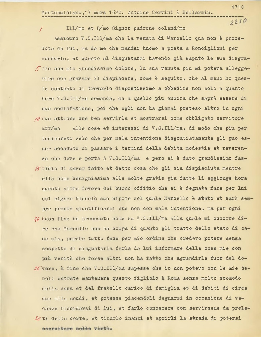 Assicuro V.S. Ill.ma che la venuta di Marcello qua non è proceduta da lui, ma da me che mandai huomo a posta a Ronciglioni per condurlo, et quanto al disgustarmi havendo già saputo le sue disgratie con mio grandissimo dolore, la sua venuta piu mi poteva alleggerire che gravare il dispiacere, come è seguito, che al meno ho questo contento di trovarlo dispostissimo a obbedire non solo a quanto hora V.S. Ill.ma comanda, ma a quello piu ancora che saprà essere di sua sodisfatione, poi che egli non ha giamai preteso altro in ogni sua attione che ben servirla et mostrarsi come obbligato servitore aff.mo alle cose et interessi di V.S. Ill.ma, di modo che piu per indiscreto zelo che per mala intentione disgratiatamente gli può esser accaduto di passare i termini della debita modestia et reverenza che deve e porta à V.S. Ill.ma e pero si è dato grandissimo fastidio di haver fatto et detto cosa che gli sia dispiaciuta mentre ella come benignissima alle molte gratie già fatte li aggionge hora questo altro favore del buono offitio che si è degnata fare per lui col signor Niccolò suo nipote col quale Marcello è stato et sarà sempre pronto giustificarsi che non con mala intentione, ma per ogni buon fine ha proceduto come sa V.S. Ill.ma alla quale mi occorre di re che Marcello non ha colpa di quanto gli tratto dello stato di ca sa mia, perche tutto fece per mio ordine che credevo potere senza sospetto di disgustarla farla da lui informare delle cose mie con più verità che forse altri non ha fatto che agrandirle fuor del dovere, à fine che V.S. Ill.ma sapesse che io non potevo con le mie de boli entrate mantenere questo figliolo à Roma senza molto scomodo della casa et del fratello carico di famiglia et di debiti di circa due mila scudi, et potesse piacendoli degnarsi in occasione di vacanze ricordarsi di lui, et farlo conoscere con servirsene da prelati della corte, et tirarlo inanzi et aprirli la strada di potersi