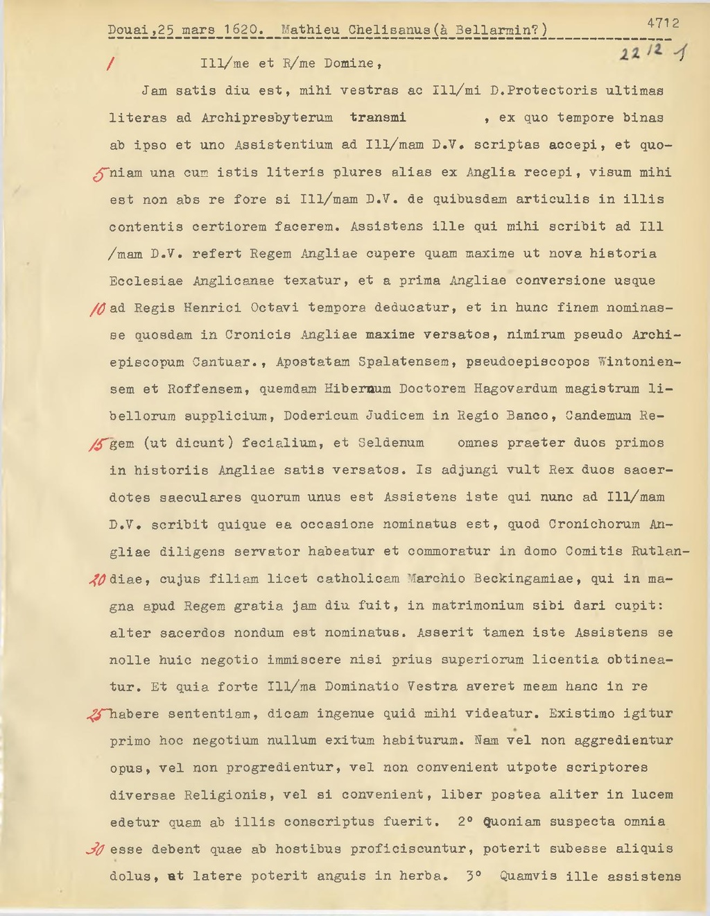Jam satis diu est, mihi vestras ac Ill.mi D. Protectoris ultimas literas ad Archipresbyterum transmi..., ex quo tempore Dinas ab ipso et uno Assistentium ad Ill.mam D.V. scriptas accepi, et quoniam una cum istis literis plures alias ex Anglia recepi, visum mihi est non abs re fore si Ill.mam D.V. de quibusdam articulis in illis contentis certiorem facerem. Assistens ille qui mihi scribit ad Ill.mam D.V. refert Regem Angliae cupere quam maxime ut nova historta Ecclesiae Anglicana texatur, et a prima Angliae conversione usque ad Regis Henrici Octavi tempora deducatur, et in hunc finem nominas se quosdam in Cronicis Angliae maxime versatos, nimirum pseudo Archiepiscopum Cantuar., Apostatam Spalatensem, pseudoepiscopos Wintoniensem et Roffensem, quemdam Hibernum Doctorem Hagovardum magistrum libellorum supplicium, Dodericum Judicem in Regio Banco, Candemum Regem (ut dicunt) fecialium, et Seldenum omnes praeter duos primos in historiis Angliae satis versatos. Is adjungi vult Rex duos sacerdotes saeculares quorum unus est Assistens iste qui nunc ad Ill.mam D.V. scribit quique ea occasione nominatus est, quod Oronichorum Angliae diligens servator habeatur et commoratur in domo Comitis Rutlandiae, cujus filiam licet catholicam Marchio Beckingamiae, qui in magna apud Regem gratta jam diu fuit, in matrimonium sibi dar! cupit: alter sacerdos nondum est nominatus. Asserit tamen iste Aasistens se nolle huic negotio immiscere nisi prius superiorum licentia obtineatur. Et quia forte Ill.ma Dominatio Vestra averet meam hanc in re habere sententiam, dicam ingenue quid mihi videatur. Existimo igitur primo hoc negotium nullum exitum habiturum. Nam vel non aggredientur opus, vel non progredientur, vel non convenient utpote scriptores
