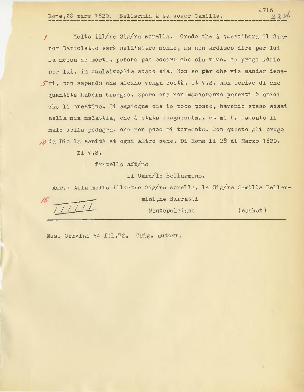 Molto ill.re Sig.ra sorella, Credo che à quest'hora il Signor Bartoletto sarà nell'altro mondo, ma non ardisco dire per lui la messa de morti, perche può essere che sia vivo. Ma prego Iddio per lui, in qualsivoglia stato sia. Non so par che via mandar denari, non sapendo che alcuno venga costà, et V.S. non scrive di che quantità habbia bisogno. Spero che non mancaranno parenti ò amici che li prestino. Si aggiogne che io poco posso, havendo speso assai nella mia malattia, che è stata longhissima, et mi ha lassato il male della podagra, che non poco mi tormenta. Con questo gli prego da Dio la sanità et ogni altro bene. Di Roma li 28 di Marzo 1620.