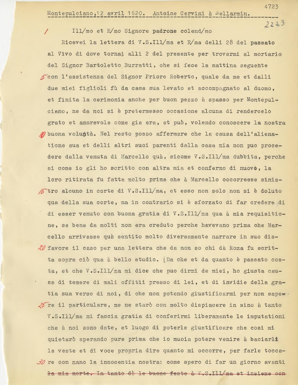 Ricevei la lettera di V.S. Ill.ma et R.ma delli 28 del passato al Vivo di dove tornai alli 2 del presente per trovarmi al mortario del Signor Bartoletto Burratti, che si fece la mattina seguente con l'assistenza del Signor Priore Roberto, quale da me et dalli due miei figlioli fù da casa sua levato et accompagnato al duomo, et finita la cerimonia anche per buon pezzo à spasso per Montepulciano, ne da noi si è pretermesso occasione alcuna di rendercelo grato et amorevole come già era, et può, volendo conoscere la nostra buona voluntà. Nel resto posso affermare che la causa dell'alienatione sua et delli altri suoi parenti dalla casa mia non può procedere dalla venuta di Marcello qua, sicome V.S. Ill.ma dubbila, perche si come io gli ho scritto con altra mia et confermo di nuovo, la loro ritirata fu fatta molto prima che è Marcello occorresse sinistro alcuno in corte di V.S. Ill.ma, et esso non solo non si è doluto qua della sua corte, ma in contrario si è sforzato di far credere di di esser venuto con buona gratia di V.S. Ill.ma qua à mia requisitione, se bene da molti non era creduto perche bevevano prima che Marcello arrivasse qua sentito molto diversamente narrare in suo disfavore il caso per una lettera che da non so chi dà Roma fu scritta sopra ciò qua à bello studio. [Da che et da quanto è passato costa, et che V.S. Ill.ma mi dice che può dirmi de miei, ho giusta causa di temere di mali offitii presso di lei, et di invidie della gratia sua verso di noi, di che non potendo giustificarmi per non sapere il particulare, me ne starò con molto dispiacere in sino à tanto V.S. Ill.ma mi faccia gratia di conferirmi liberamente le imputationi che à noi sono date, et luogo di poterle giustificare che cosi mi quieterò sperando pure prima che io muoia potere venire à baciarli la veste et di voce propria dire quanto mi occorre, per farle toccare con mano la innocentia nostra: come spero di far un giorno avanti